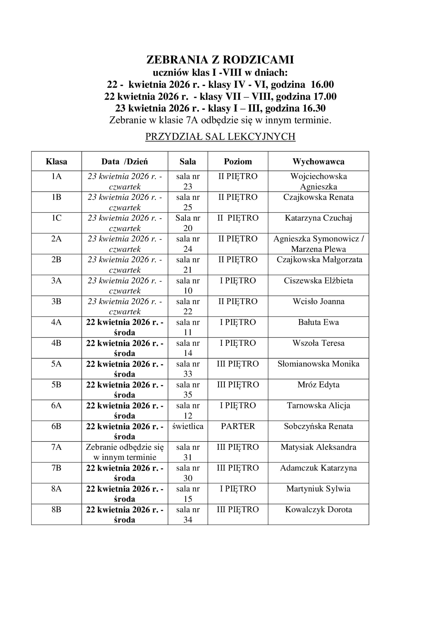 Przydział sal lekcyjnych pod opiekę nauczycieli