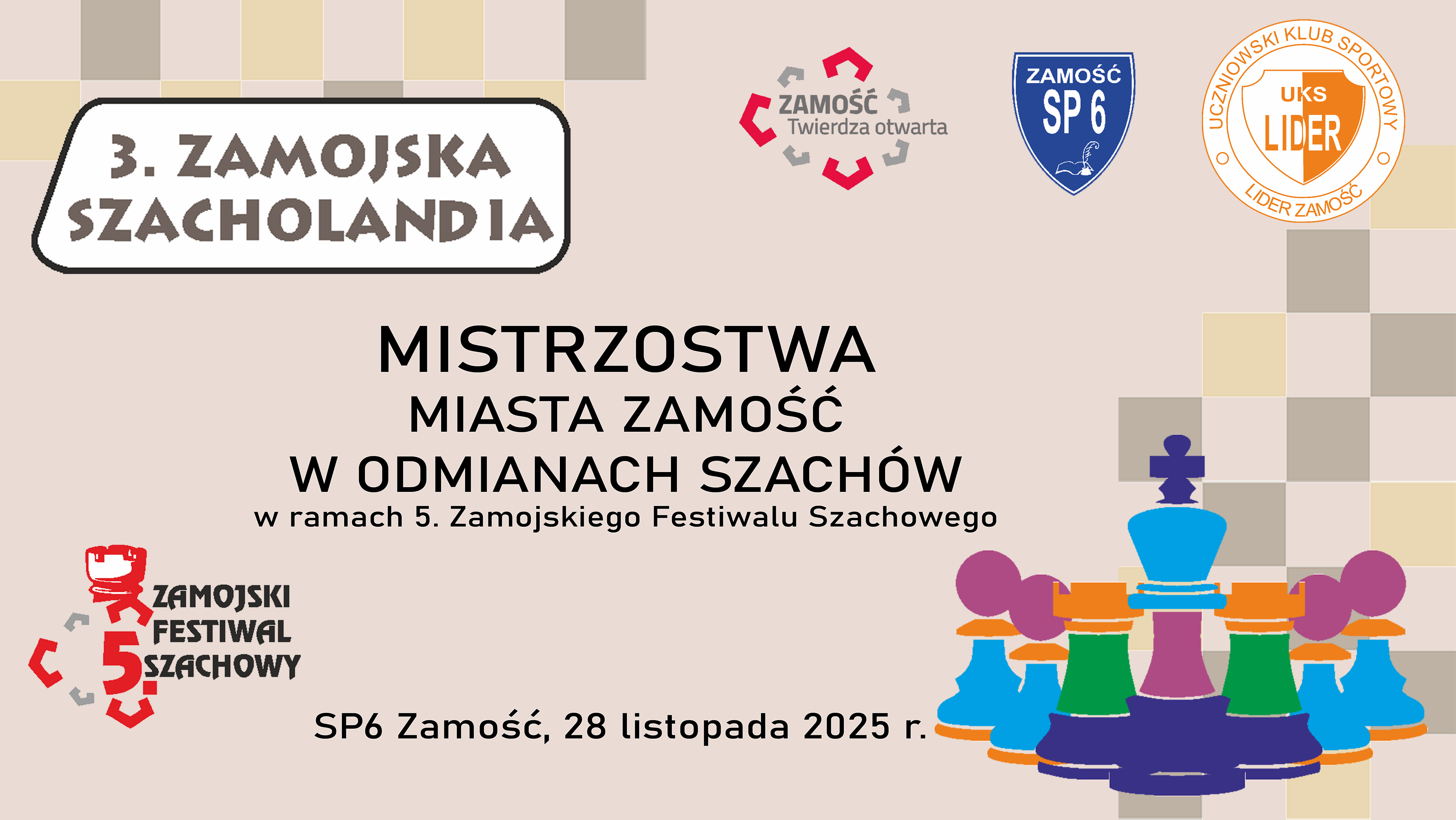 28 listopada 2025 r. (piątek) w Szkole Podstawowej Nr 6 w Zamościu odbędą się Mistrzostwa Miasta w odmianach szachów „3. Zamojska Szacholandia 2025” w ramach 5. Zamojskiego Festiwalu Szachowego.