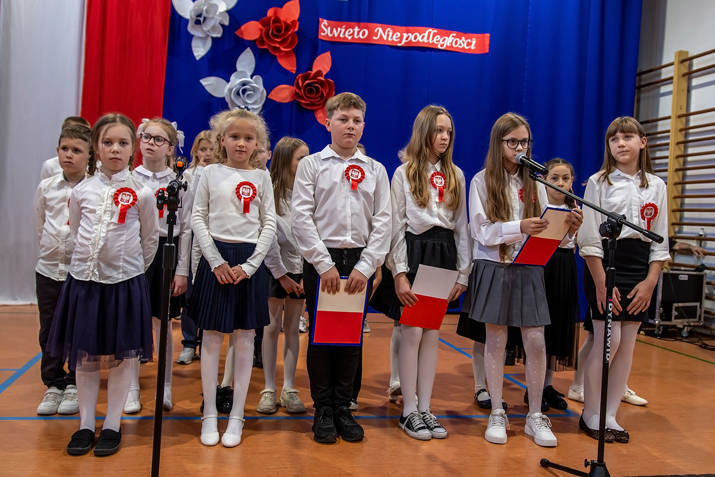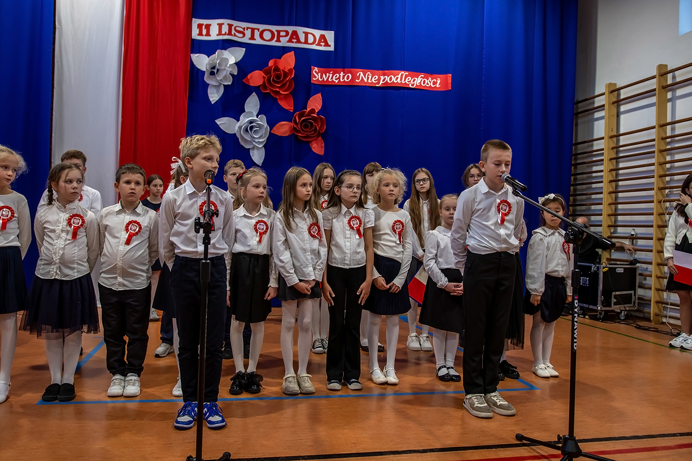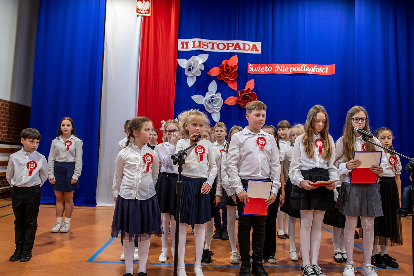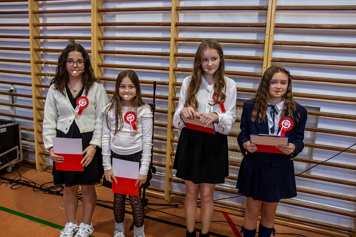 W czwartek, 13 listopada 2025 r. odbyła się w naszej szkole uroczysta akademia z okazji Narodowego Święta Niepodległości. Uczniowie klas: IIb, Va i Vb wraz z nauczycielami przygotowali dla społeczności szkolnej montaż słowno – muzyczny opisujący drogę Polski do odzyskania niepodległości po 123 latach niewoli. Na zakończenie spotkania „Dekalog Patrioty” zadeklamowała Daria Sobczuk z klasy VIIIb.