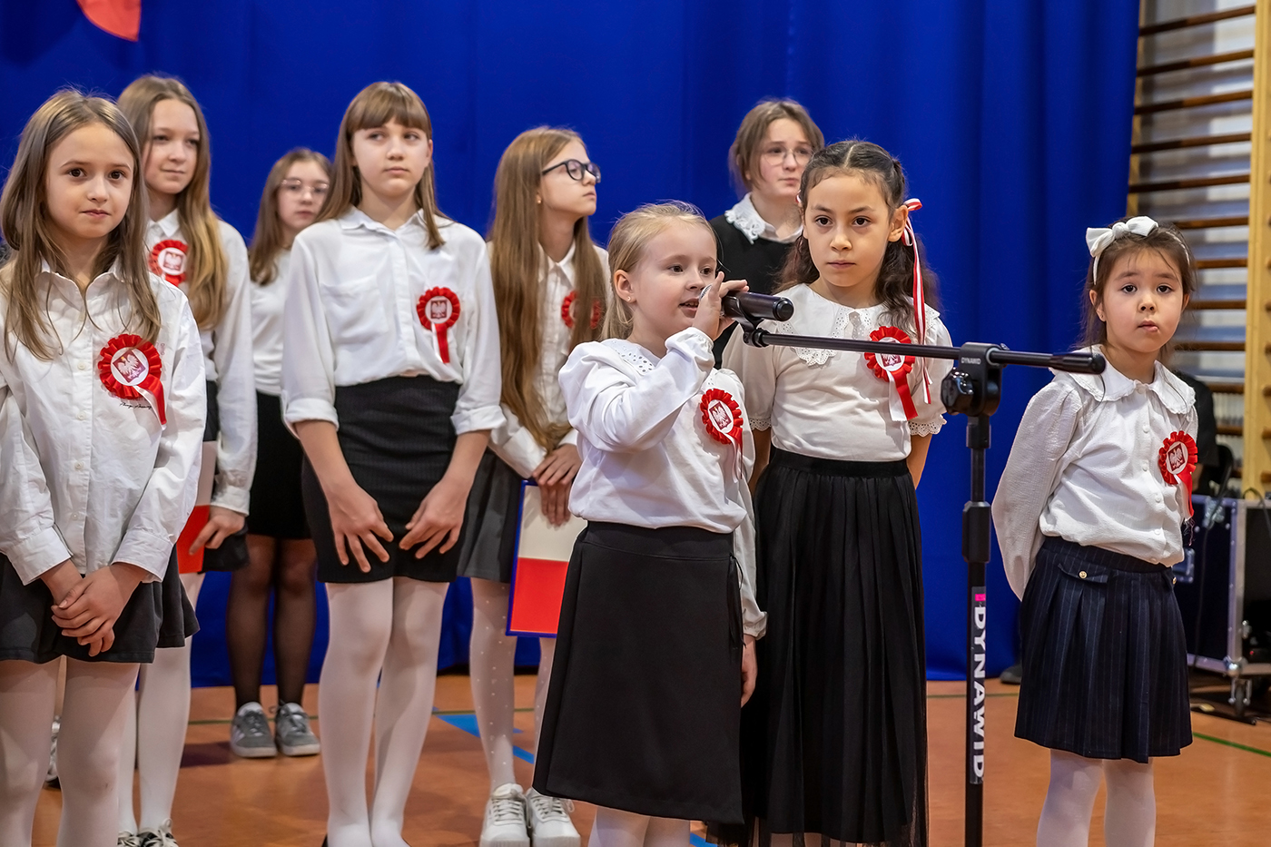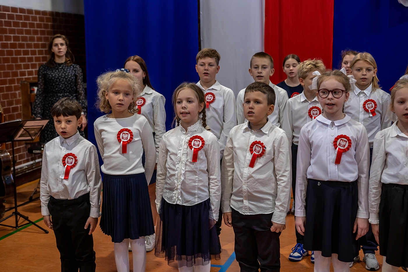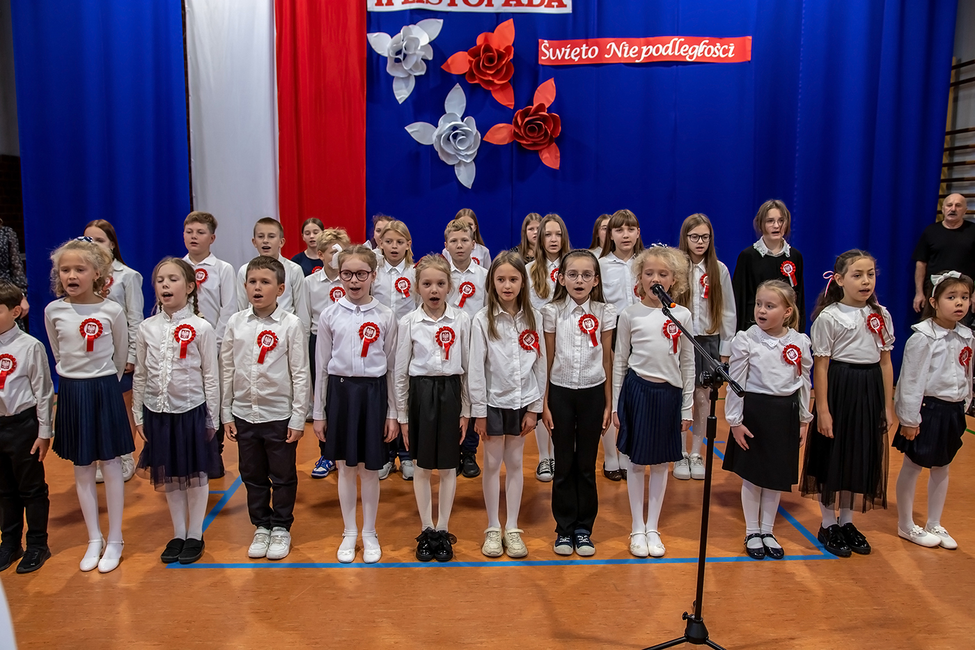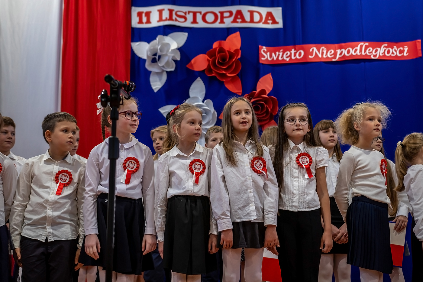 W czwartek, 13 listopada 2025 r. odbyła się w naszej szkole uroczysta akademia z okazji Narodowego Święta Niepodległości. Uczniowie klas: IIb, Va i Vb wraz z nauczycielami przygotowali dla społeczności szkolnej montaż słowno – muzyczny opisujący drogę Polski do odzyskania niepodległości po 123 latach niewoli. Na zakończenie spotkania „Dekalog Patrioty” zadeklamowała Daria Sobczuk z klasy VIIIb.
