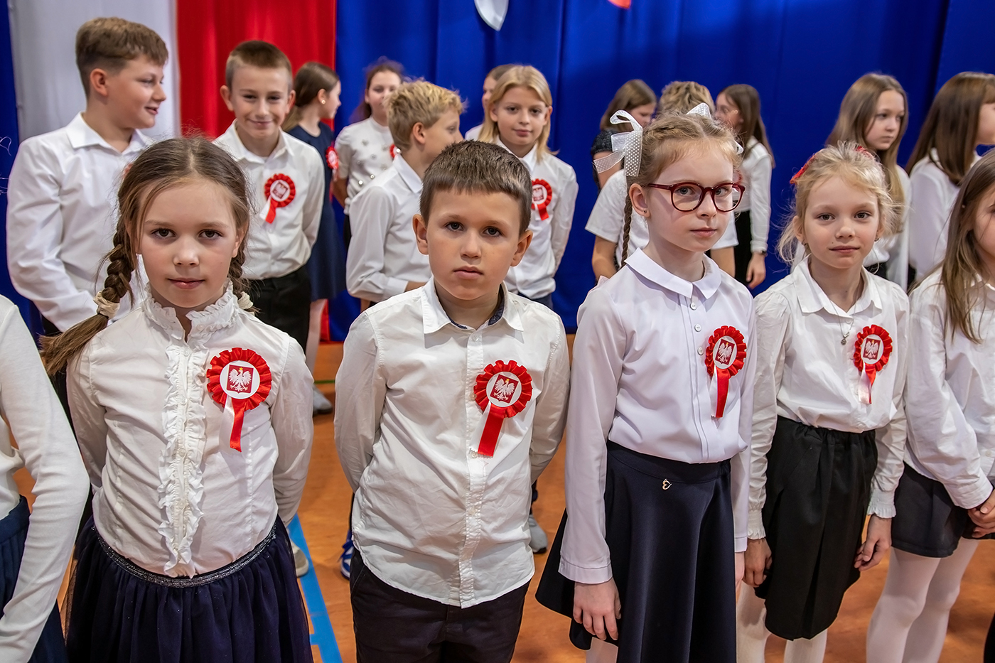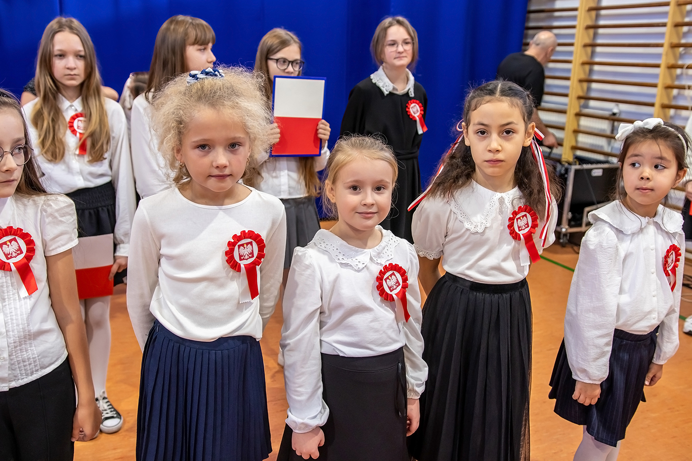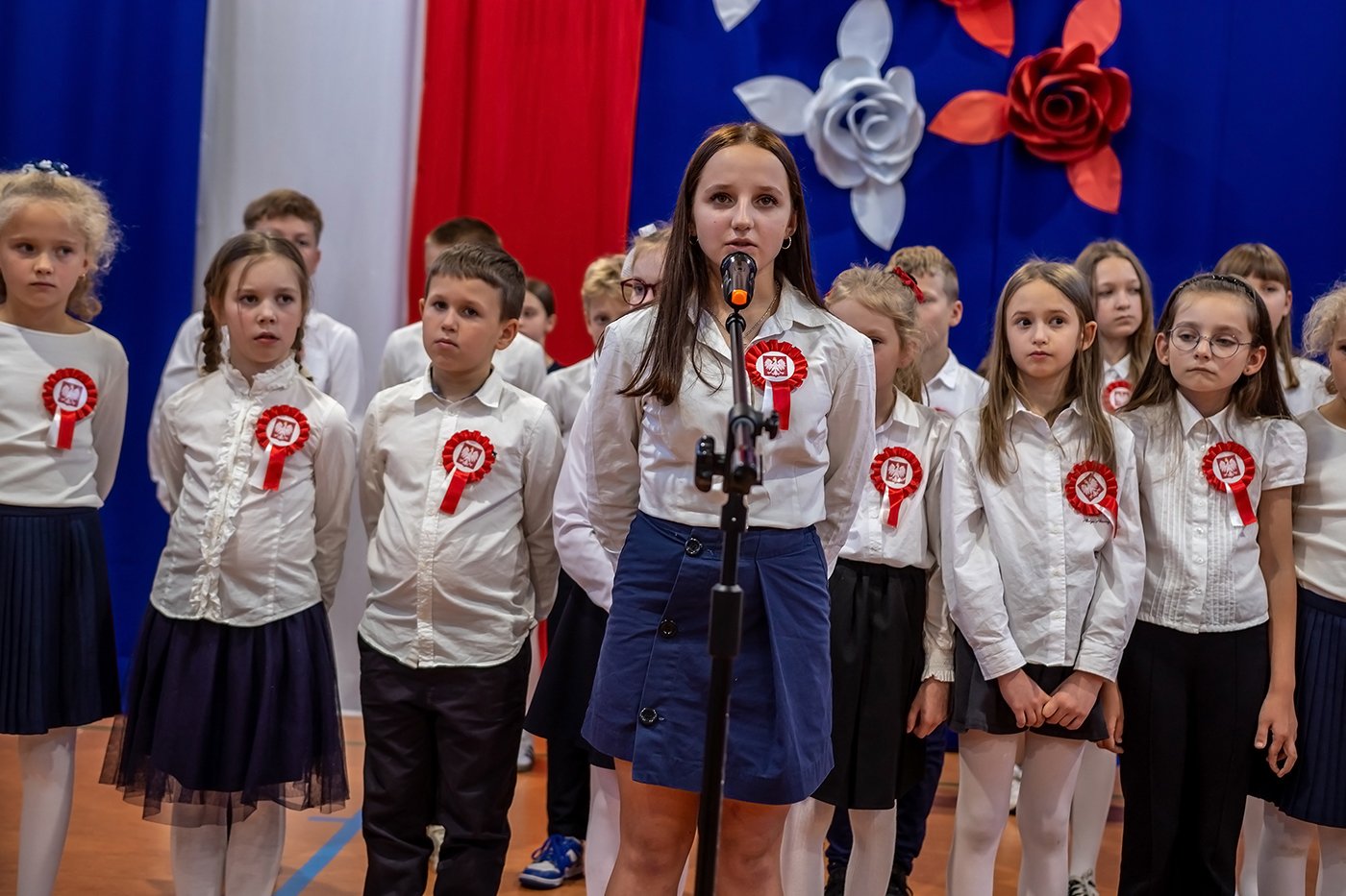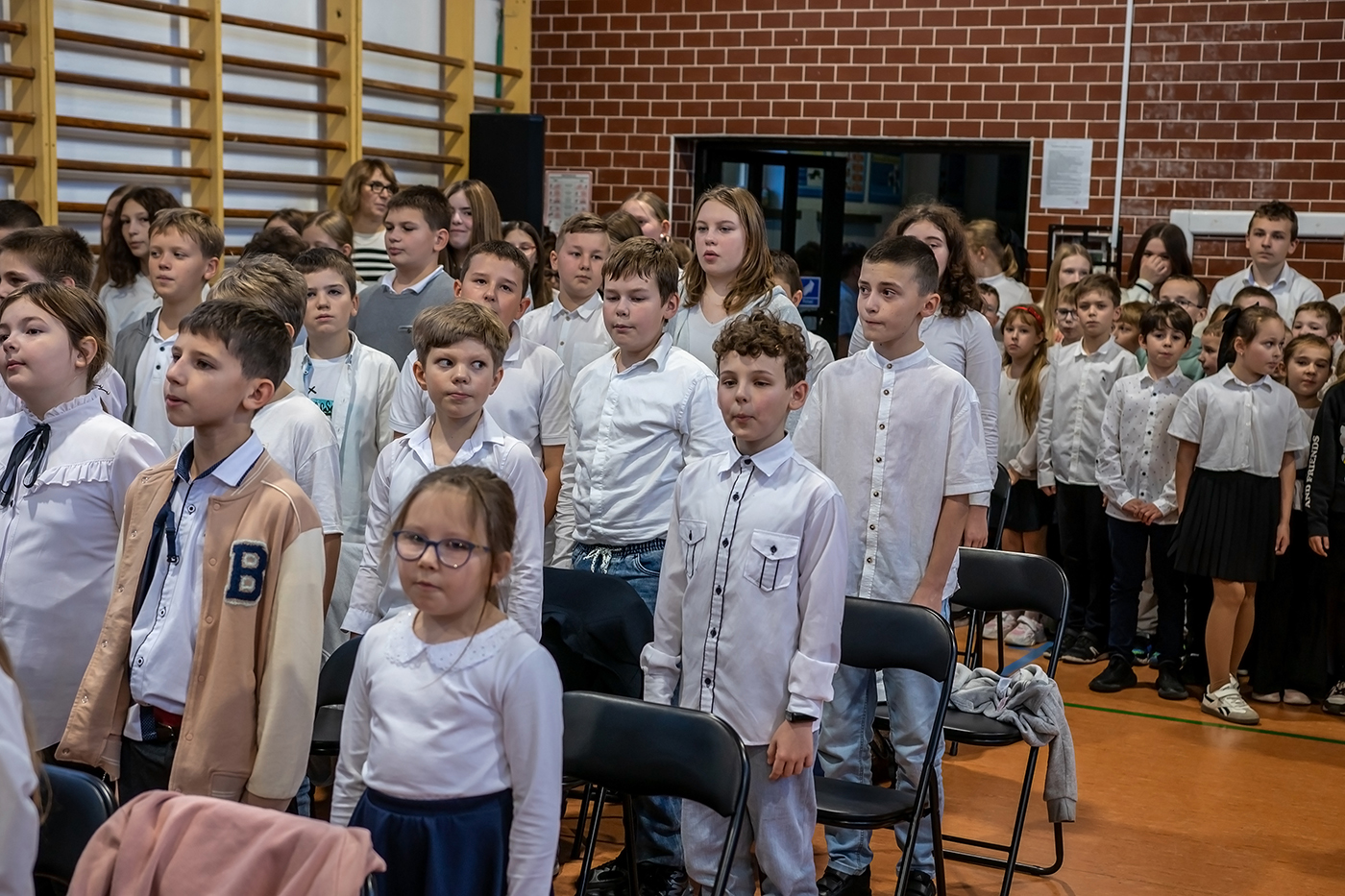 W czwartek, 13 listopada 2025 r. odbyła się w naszej szkole uroczysta akademia z okazji Narodowego Święta Niepodległości. Uczniowie klas: IIb, Va i Vb wraz z nauczycielami przygotowali dla społeczności szkolnej montaż słowno – muzyczny opisujący drogę Polski do odzyskania niepodległości po 123 latach niewoli. Na zakończenie spotkania „Dekalog Patrioty” zadeklamowała Daria Sobczuk z klasy VIIIb.
