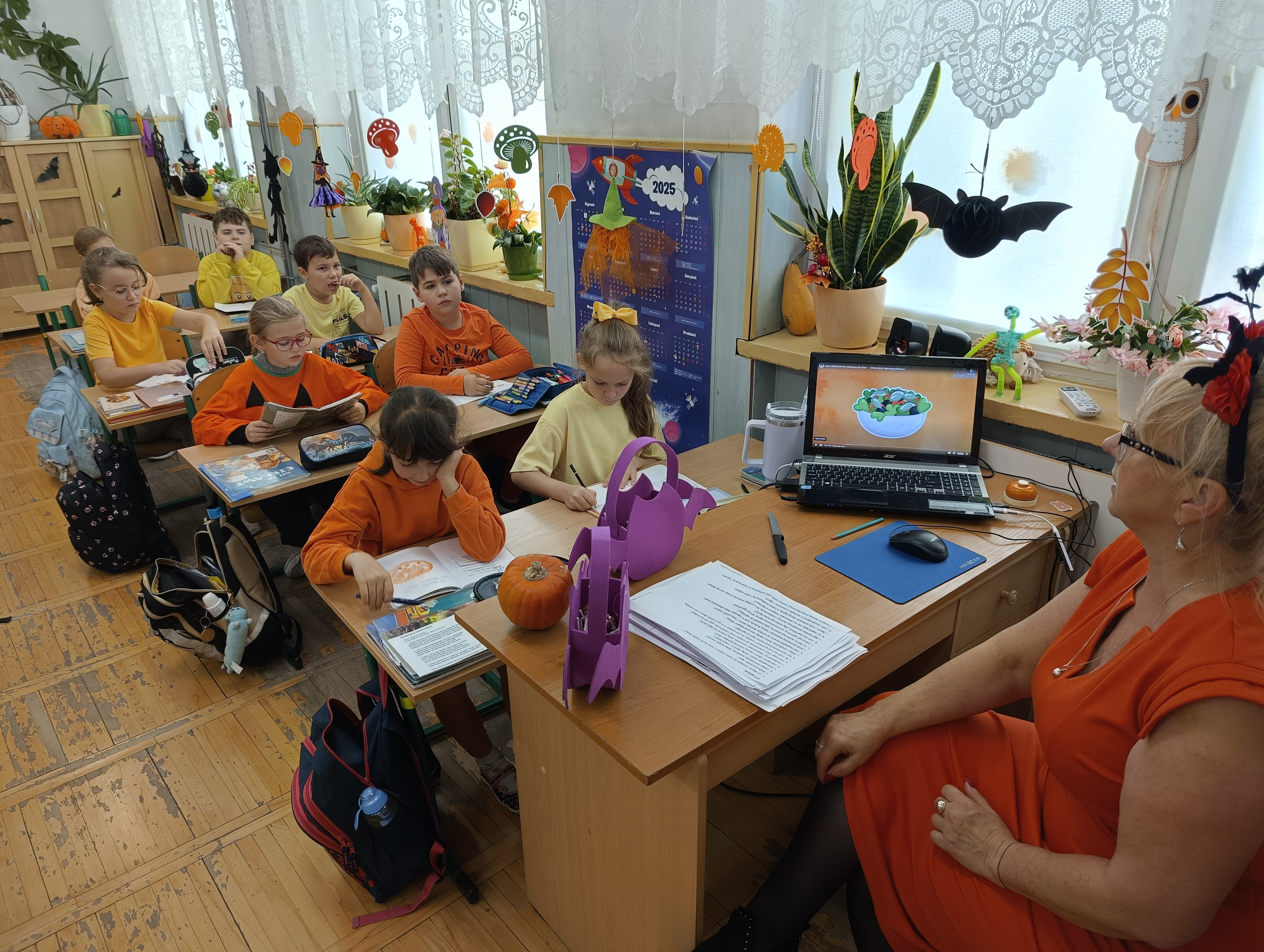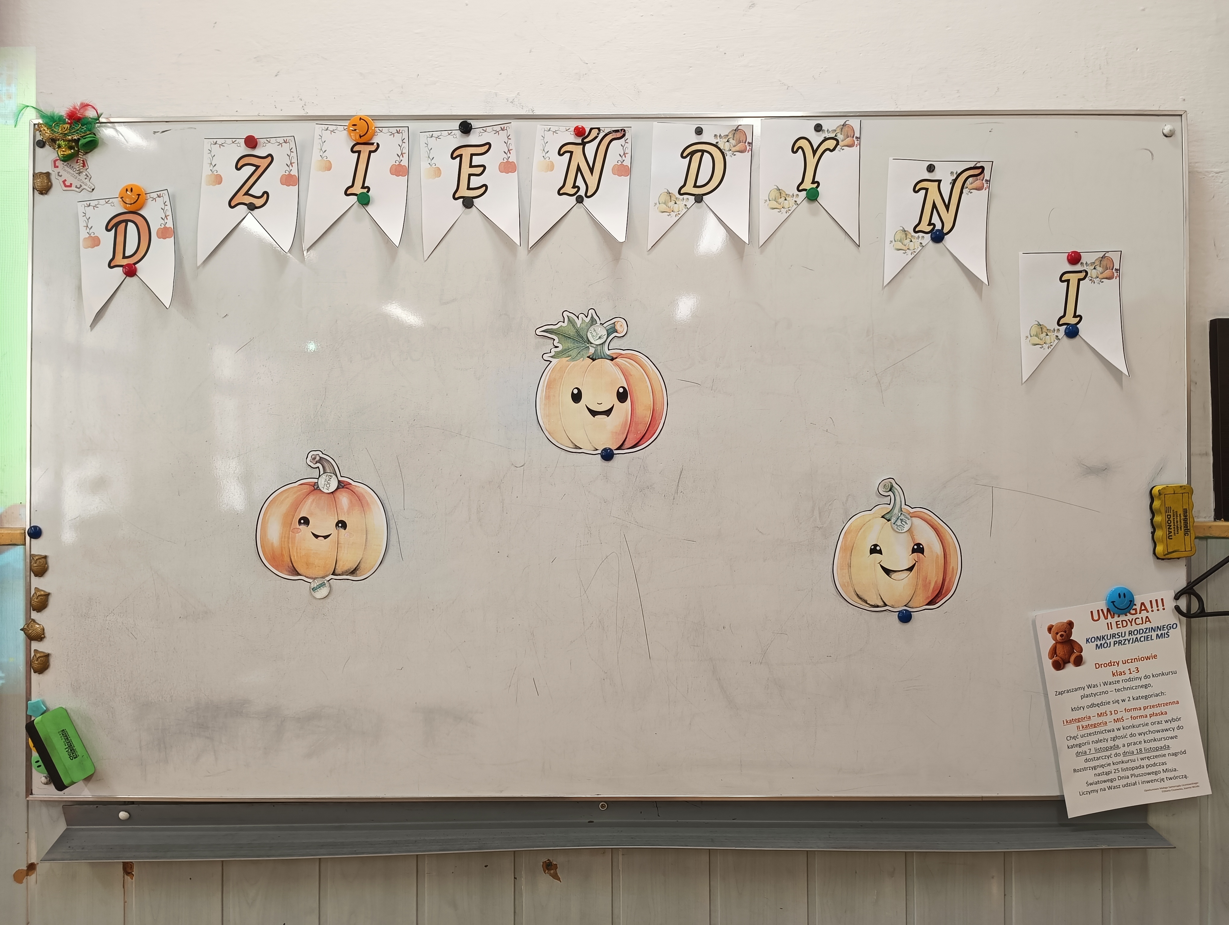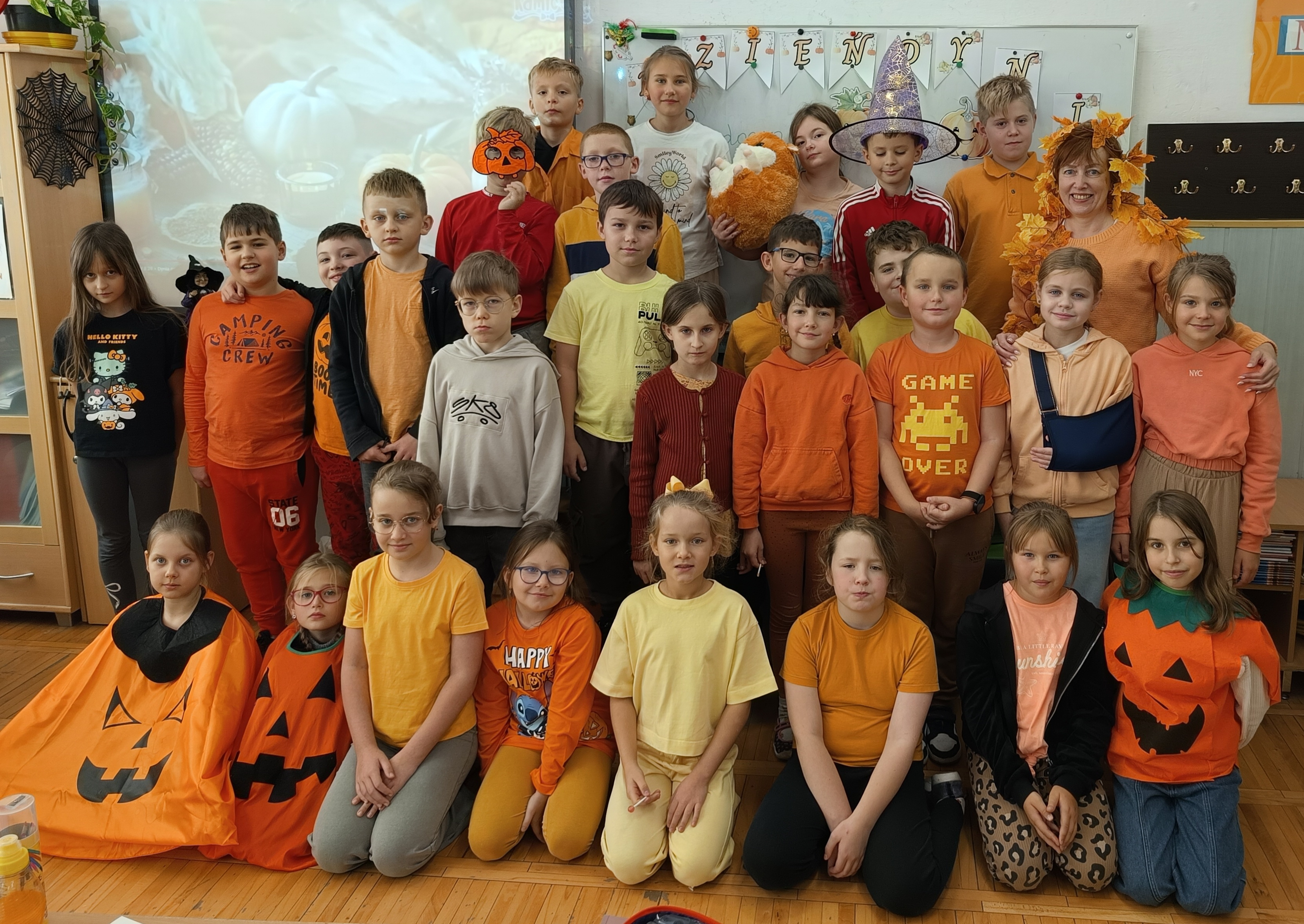 Święto Dyni obchodzone jest zazwyczaj 31 października, w dniu powiązanym z Halloween. Jest to czas celebrowania jesiennych warzyw, organizowania zabaw dla dzieci i dorosłych, takich jak np. rzeźbienie w dyniach. Chociaż nie jest to oficjalne święto narodowe, wiele szkół organizuje związane z nim obchody i wydarzenia. Po raz drugi nasza klasa zorganizowała Dzień Dyni. Dzieci i panie ubrały się w kolor pomarańczowy. Na początek Pani podała hasło: „Cukierek albo psikus”. Wybraliśmy oczywiście słodycze i każde z nas dostało po lizaku. Panie przybrały całą klasę w różne śmieszne rzeczy związane z tym świętem. Na zajęciach Pani wyświetliła nam film o dyni o jej rozwoju i tradycjach związanych z tym warzywem. Na zajęciach pani pokazała na przekrój dyni i mogliśmy zobaczyć i skosztować tego warzywa. Wiemy już z tamtego roku ile można zrobić smacznych potraw z dyni. Następnie utrwalaliśmy części mowy opisując dynię i porównując ją do „wielkich zwierząt np. żyrafy. Na koniec na zajęciach technicznych malowaliśmy dynie ze śmiesznymi minami. Powstały dynie złe, groźne i uśmiechnięte. Było przy tym trochę śmiechu i zabawy. Był to udany dzień trochę słodyczy, zabawy i nauki razem!