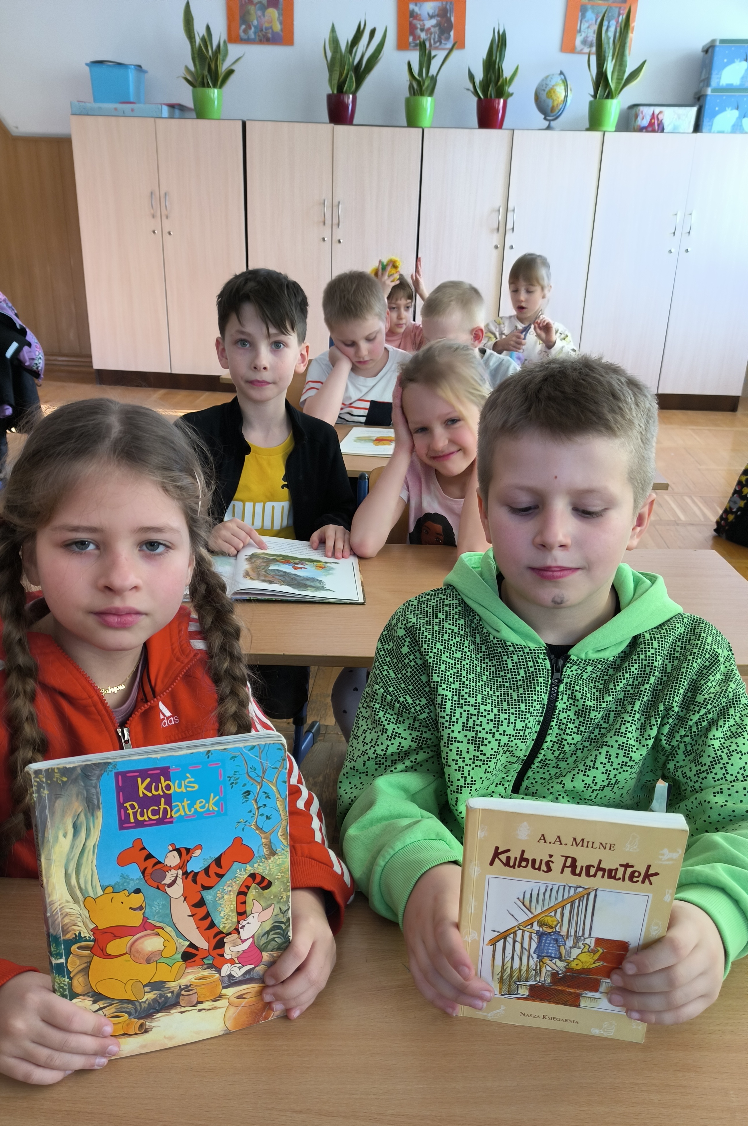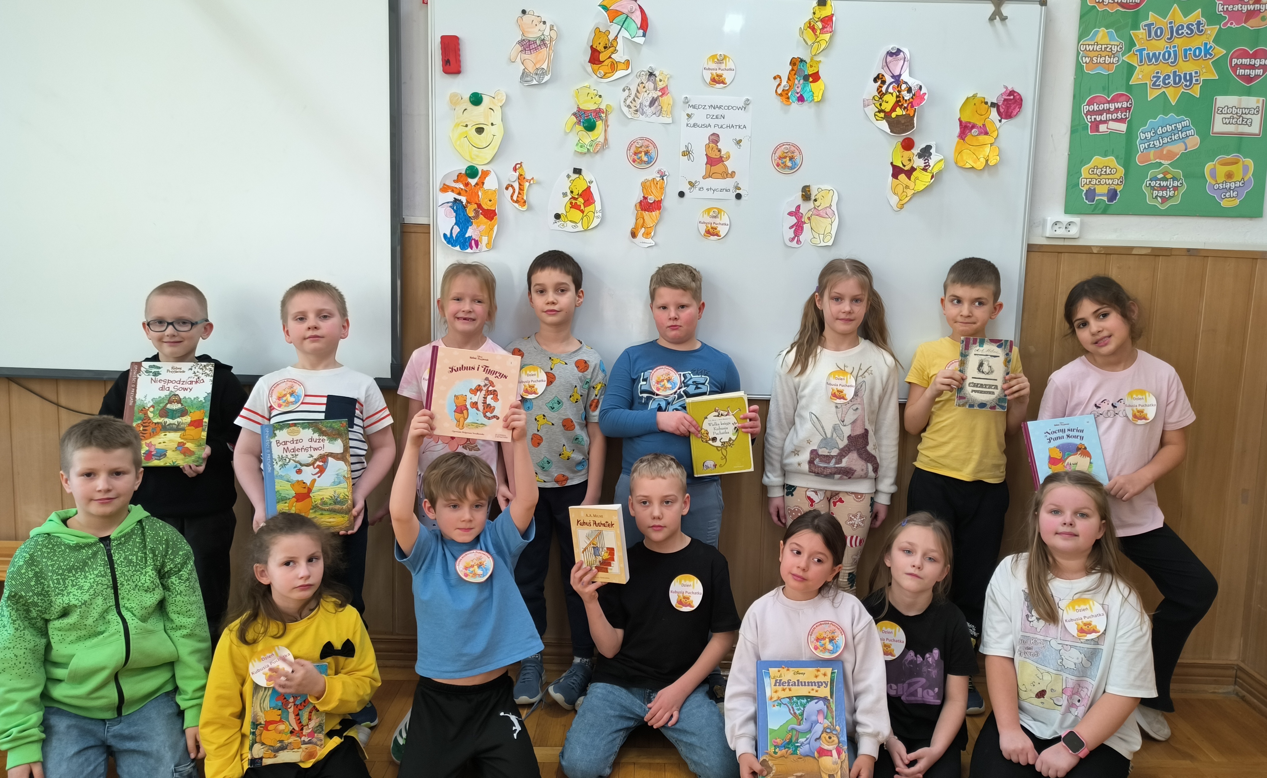 18 stycznia obchodzony jest MiÄ™dzynarodowy DzieÅ„ Kubusia Puchatka. ÅšwiÄ™to to przypada w rocznicÄ™ urodzin jego twórcy Alana Aleksandra Milne’a. Z okazji tego dnia w Å›wietlicy szkolnej odbyÅ‚y siÄ™ zajÄ™cia edukacyjne, w trakcie których uczniowie brali udziaÅ‚ w zabawach tematycznych, rozwiÄ…zywali zagadki i quiz wiedzy o Stumilowym Lesie oraz zapoznali siÄ™ z różnymi książkami o Kubusiu Puchatku. Nauczyciel prowadzÄ…cy zajÄ™cia przeczytaÅ‚ fragmenty książki o przygodach Kubusia Puchatka, a dzieci odpowiadaÅ‚y na pytania do tekstu. Uczniowie brali także udziaÅ‚ w zabawach ruchowych z wykorzystaniem chusty animacyjnej. Wykonali również „KubusiowÄ… galeriÄ™ prac plastycznych” z kolorowanek przedstawiajÄ…cych Kubusia Puchatka i jego przyjacióÅ‚. Na zakoÅ„czenie zajęć uczniowie otrzymali w nagrodÄ™ odznakÄ™ Kubusia Puchatka.