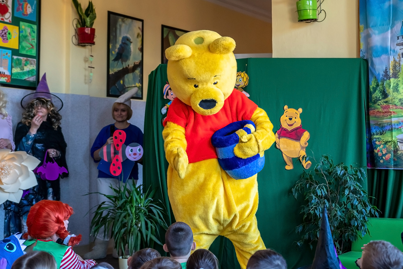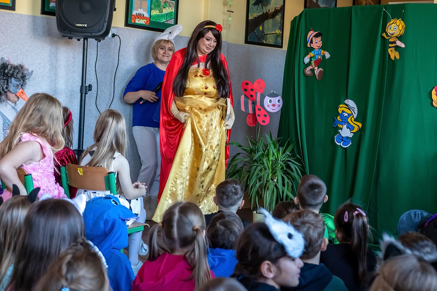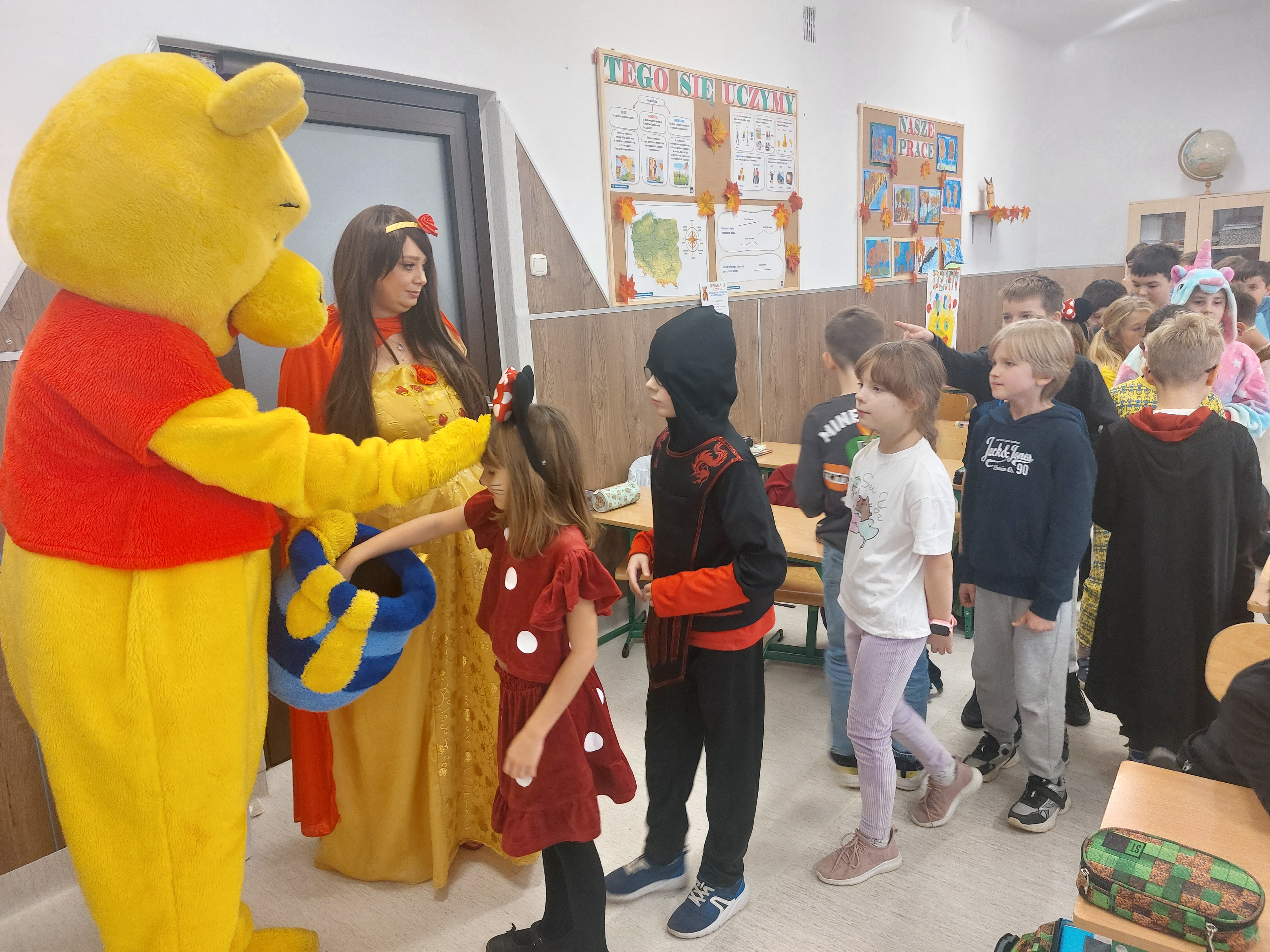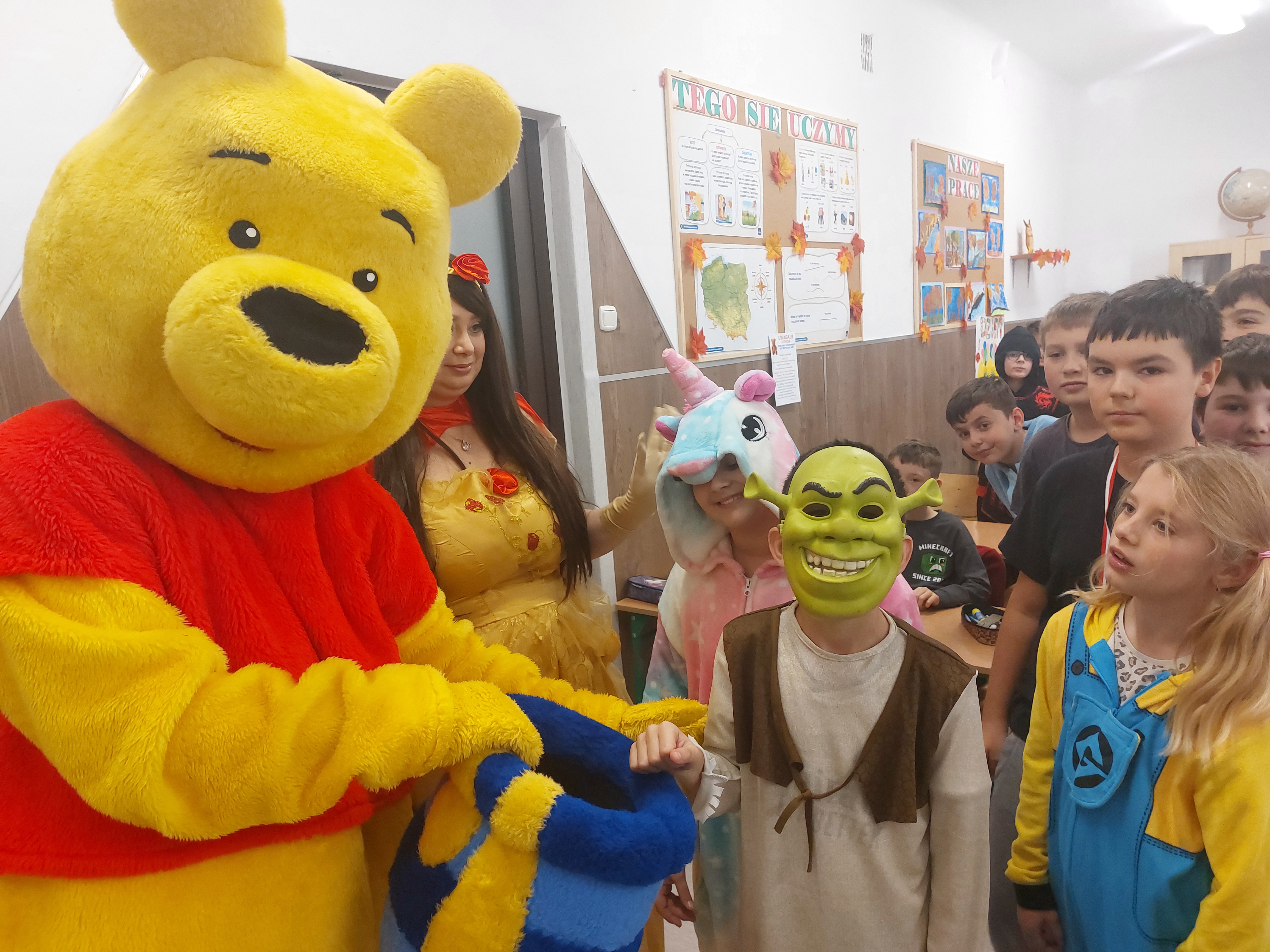 Dnia 5 listopada 2025 roku w naszej szkole obchodziliśmy Dzień Postaci z Bajek. Celem tego wydarzenia było przypomnienie wartości płynących z bajek, rozwijanie wyobraźni oraz propagowanie czytelnictwa wśród dzieci. Był to wyjątkowy i kolorowy dzień, w którym uczniowie i nauczyciele wcielili się w ulubionych bohaterów bajek i baśni. Na szkolnych korytarzach można było spotkać księżniczki, wróżki, superbohaterów oraz wiele innych znanych postaci. Odbył się quiz wiedzy o bajkach, z którym nasi uczniowie poradzili sobie wspaniale, a także w ramach akcji "Poczytaj mi, proszę" zostały przeczytane fragmenty ulubionych bajek. Nie zabrakło słodkiej niespodzianki, którą przygotował wielbiciel takich przekąsek – Kubuś Puchatek wraz z asystentką – Bellą.