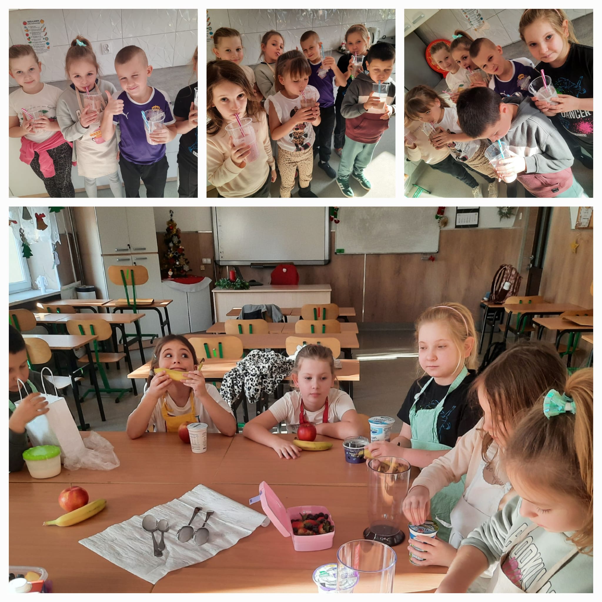 Kolejne zajęcia kulinarne za Nami! Tym razem dzieci samodzielnie przygotowywały koktajle owocowe. Myły i kroiły owoce, a następnie komponowały własne smaki, ucząc się zasad zdrowego odżywiania. Zajęcia sprawiły dzieciom dużo radości i były świetną okazją do rozwijania samodzielności oraz współpracy w grupie.