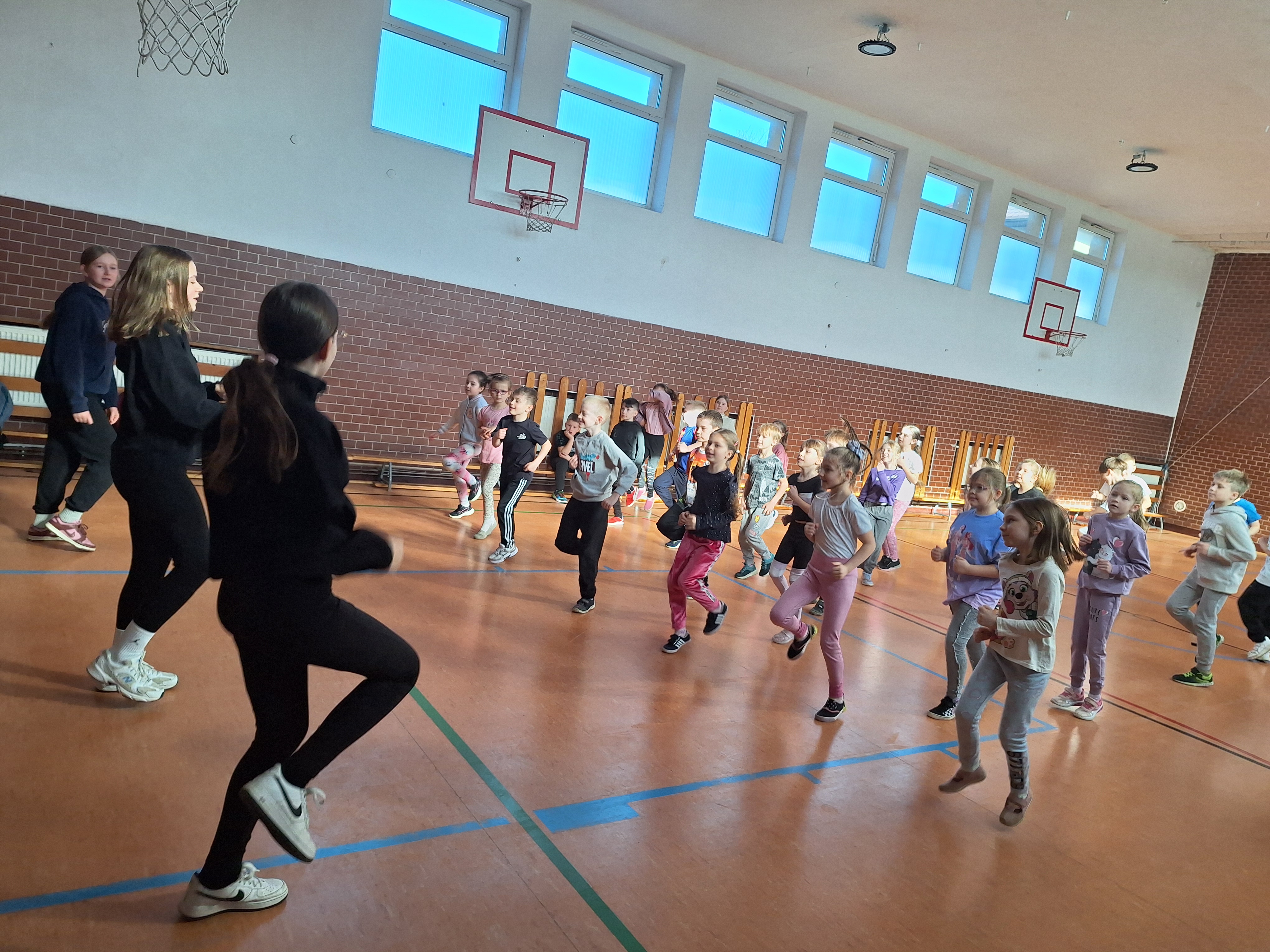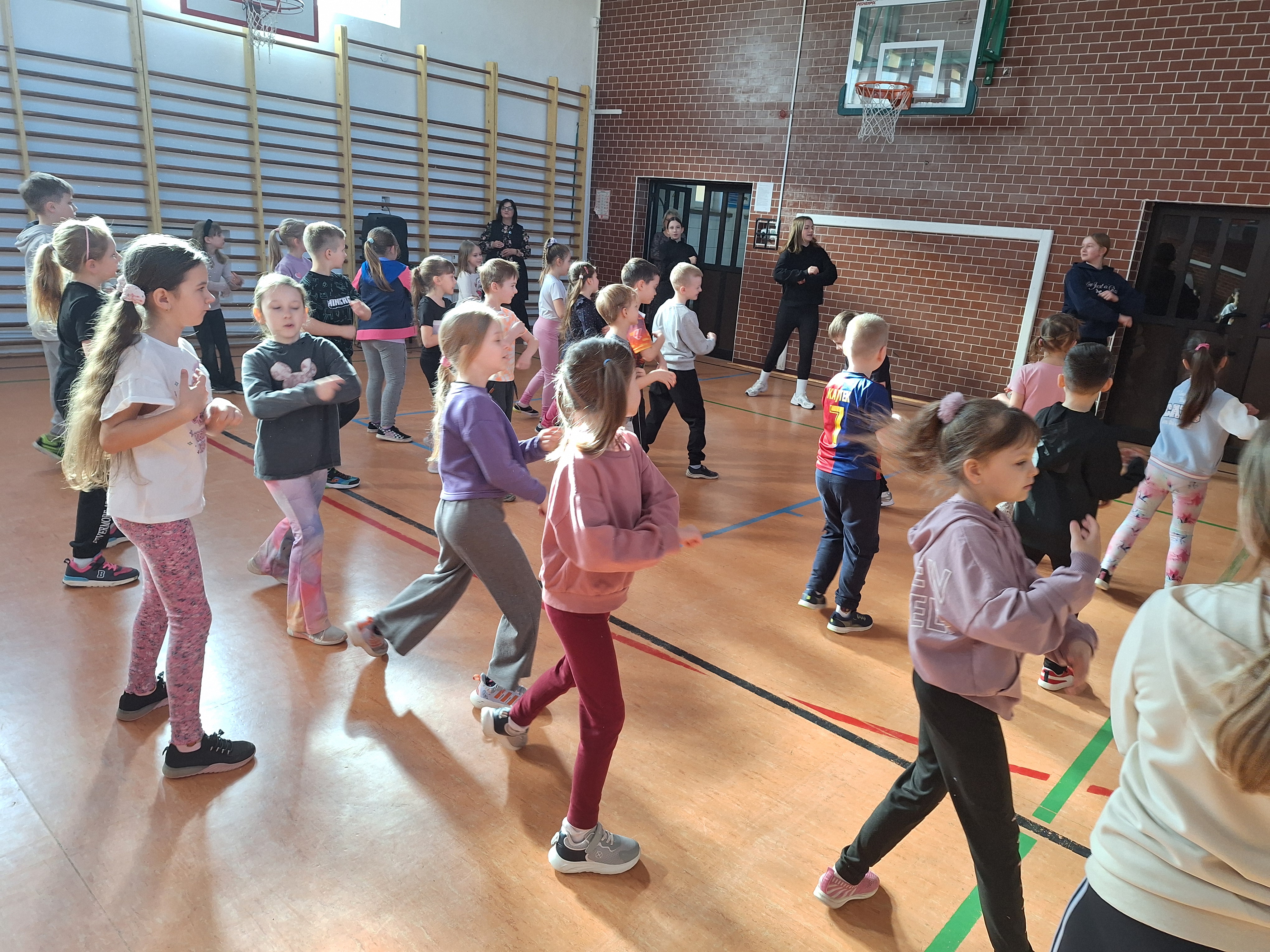 Uczniowie klasy 2a zaprosili do wspólnej zabawy sportowo – tanecznej uczniów klas I naszej szkoły. Cykliczna impreza pod hasłem „Kolorowa Gimnastyka”, tym razem, zgromadziła w sali gimnastycznej klasę 2a i jej gości – Pierwszoklasistów. Koordynatorką i pomysłodawczynią imprezy była p. Marzena Plewa. Układy gimnastyczne przy muzyce przygotowały, jak zwykle niezawodne i profesjonalne uczennice klasy 6b. To sportowe wydarzenie odbyło się w 2 etapach.