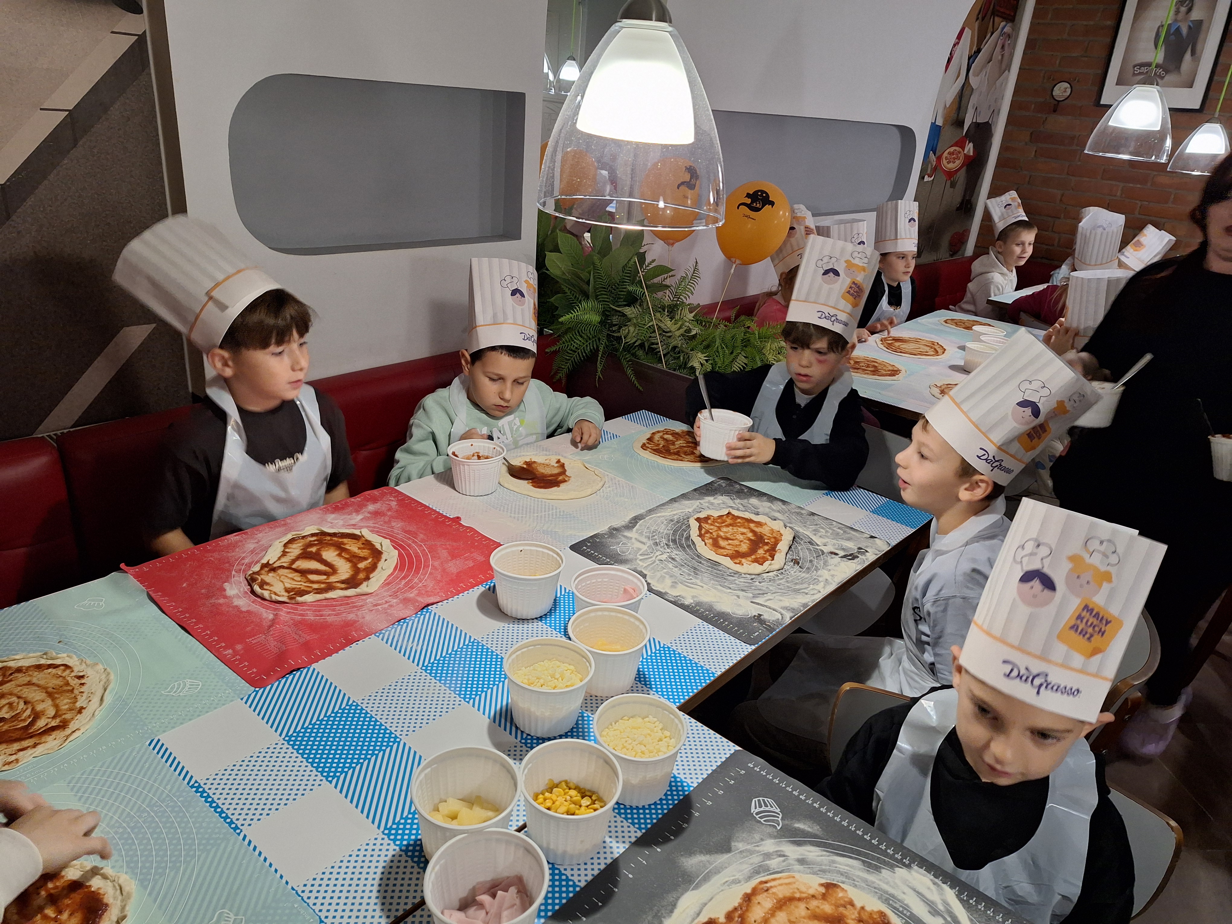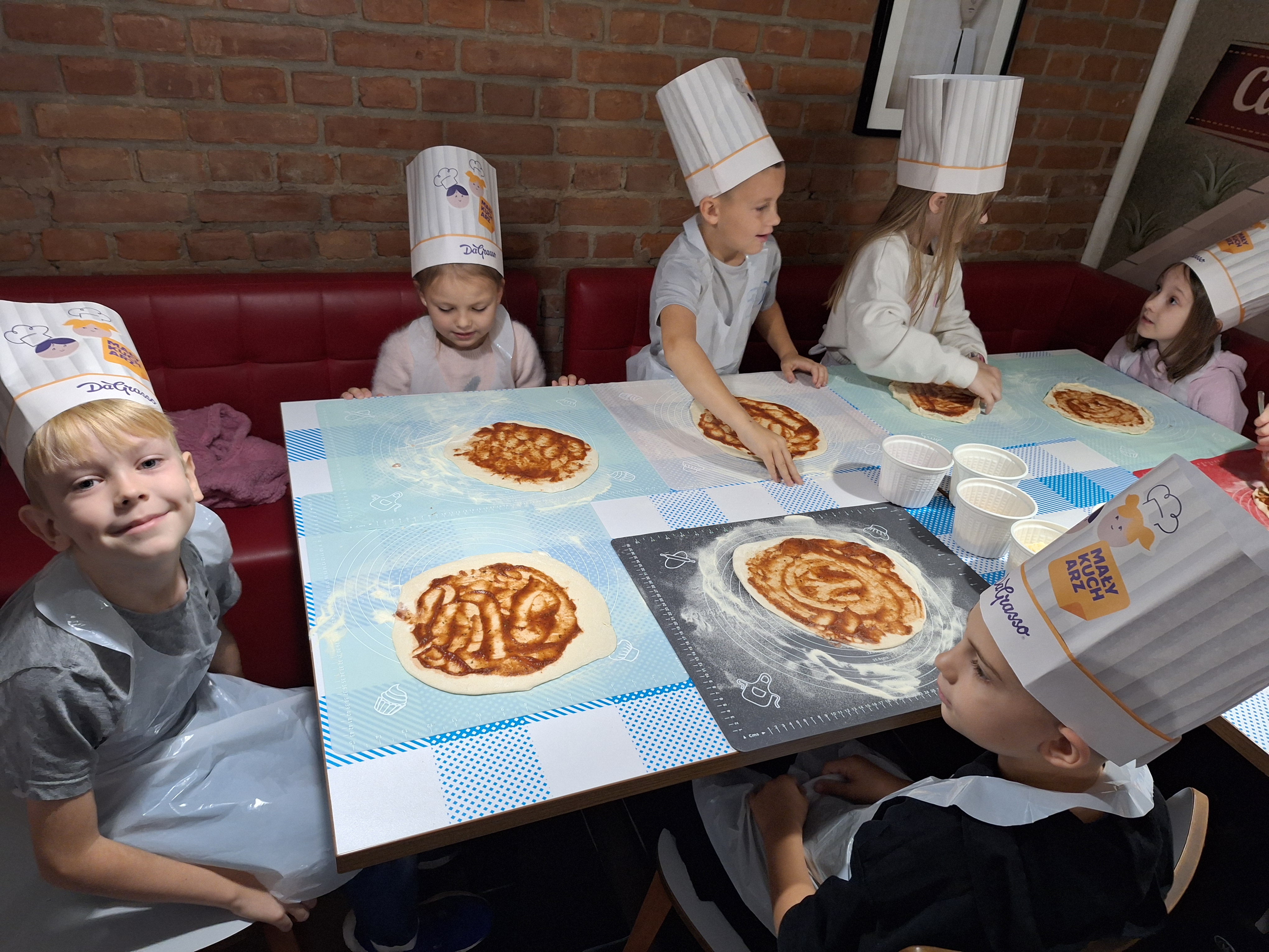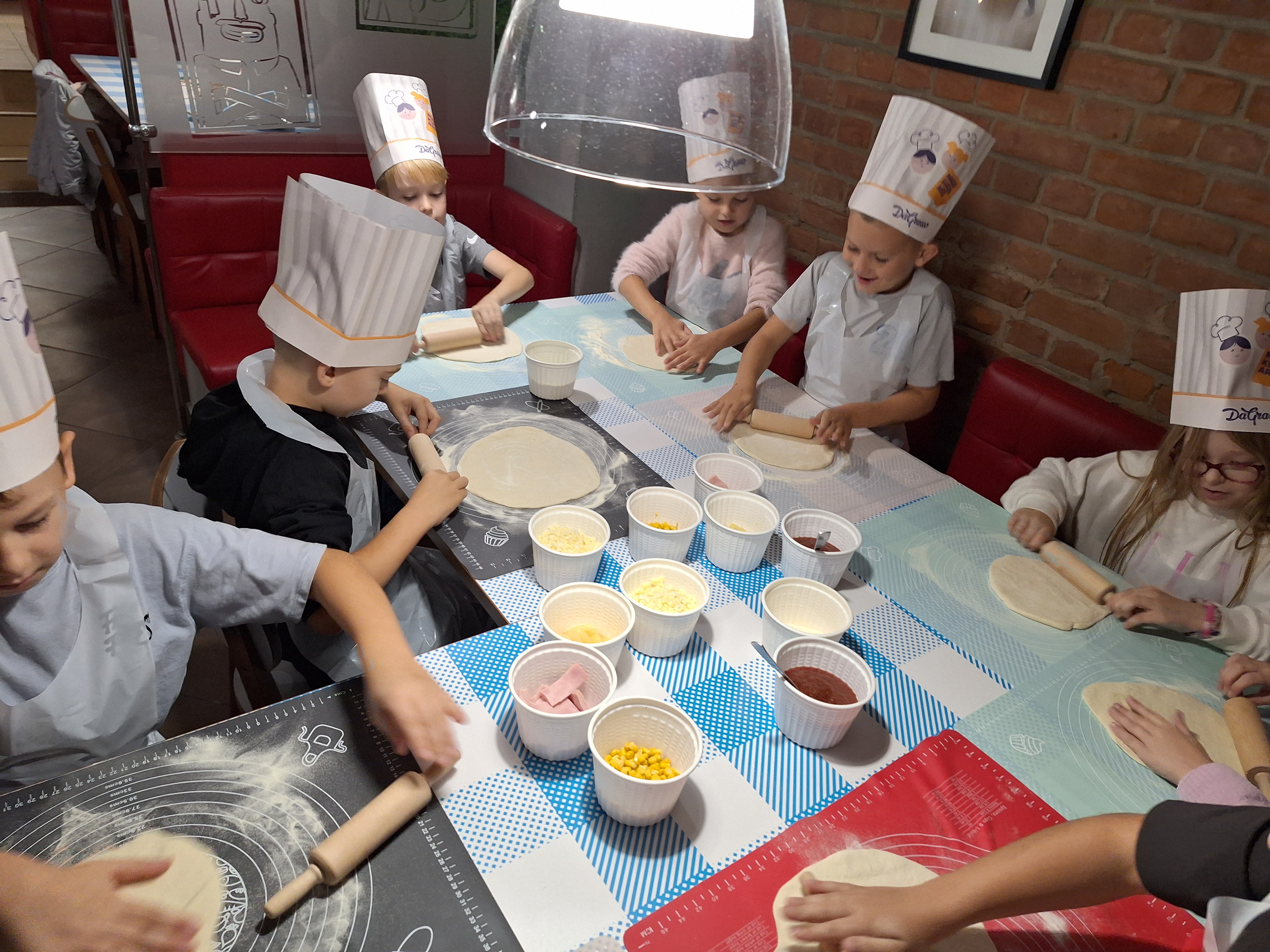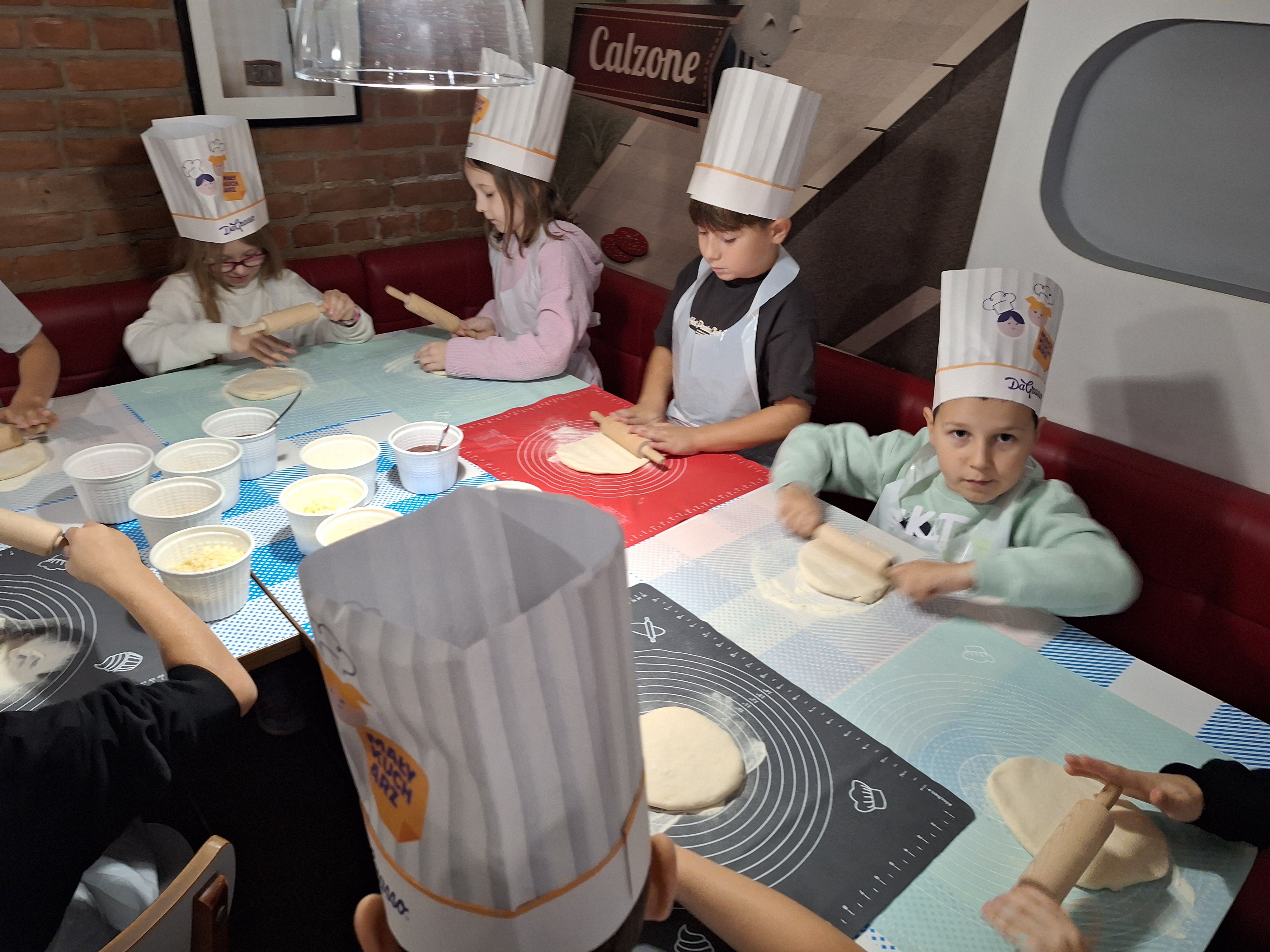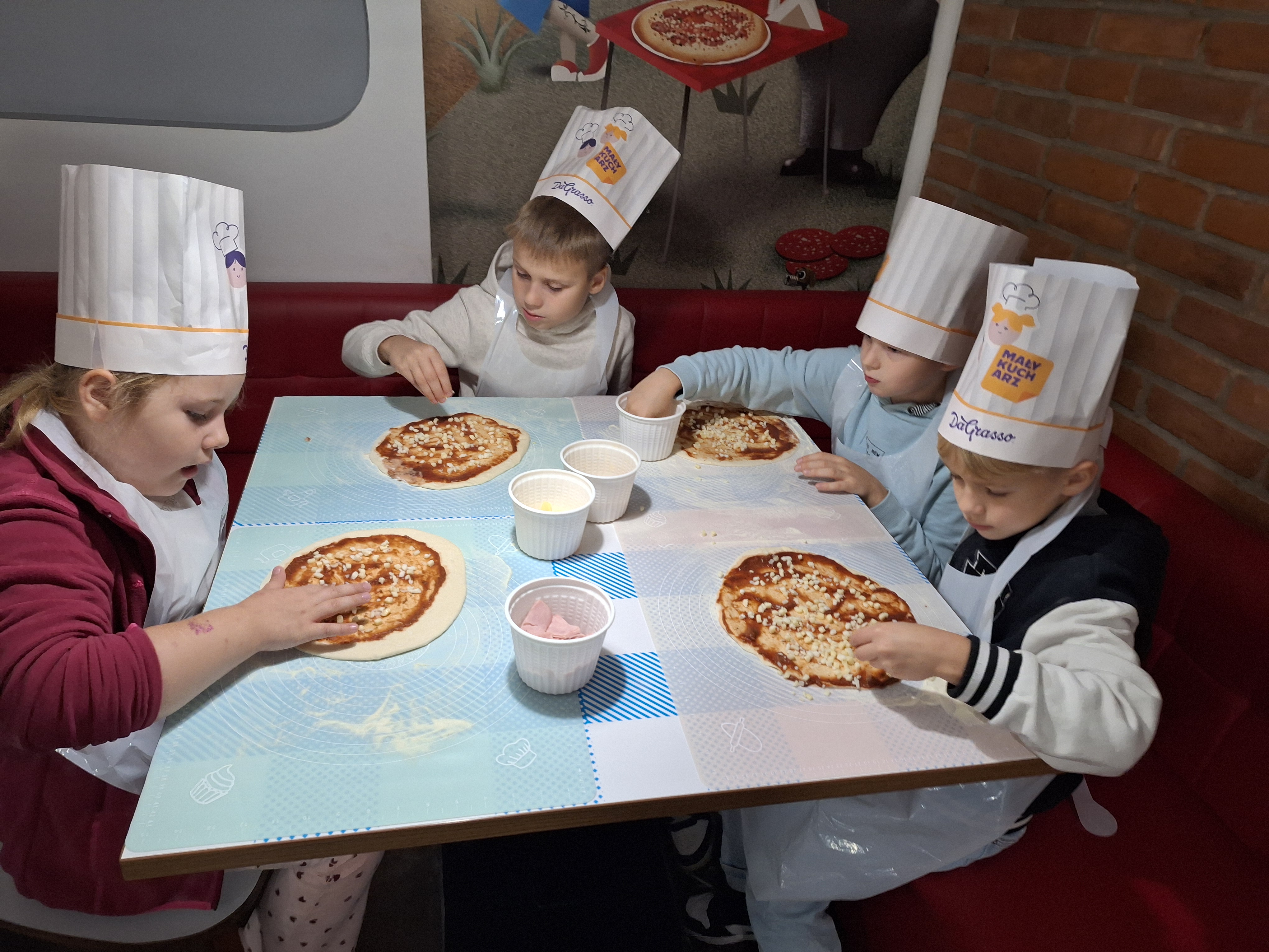 2 października 2025 roku uczniowie klasy 2a udali się do Pizzeri „Da Grasso” w celu uczestnictwa w warsztatach kulinarnych. Sprawiły one podwójną radość i satysfakcję „małym kucharzom”, którzy włożywszy niezbędne rekwizyty kucharskie – czapkę i fartuch przystąpili do wykonania 2 zadań głównych – sporządzenia własnoręcznie pizzy, a następnie jej skonsumowania. Pizza była pyszna, głównie dlatego, że każdy uczeń wykonał ją samodzielnie, a jej składniki dobrał według własnego uznania. Na zakończenie, każdy uczestnik otrzymał pamiątkowy dyplom i smyczkę z napisem „Mały Kucharz”.