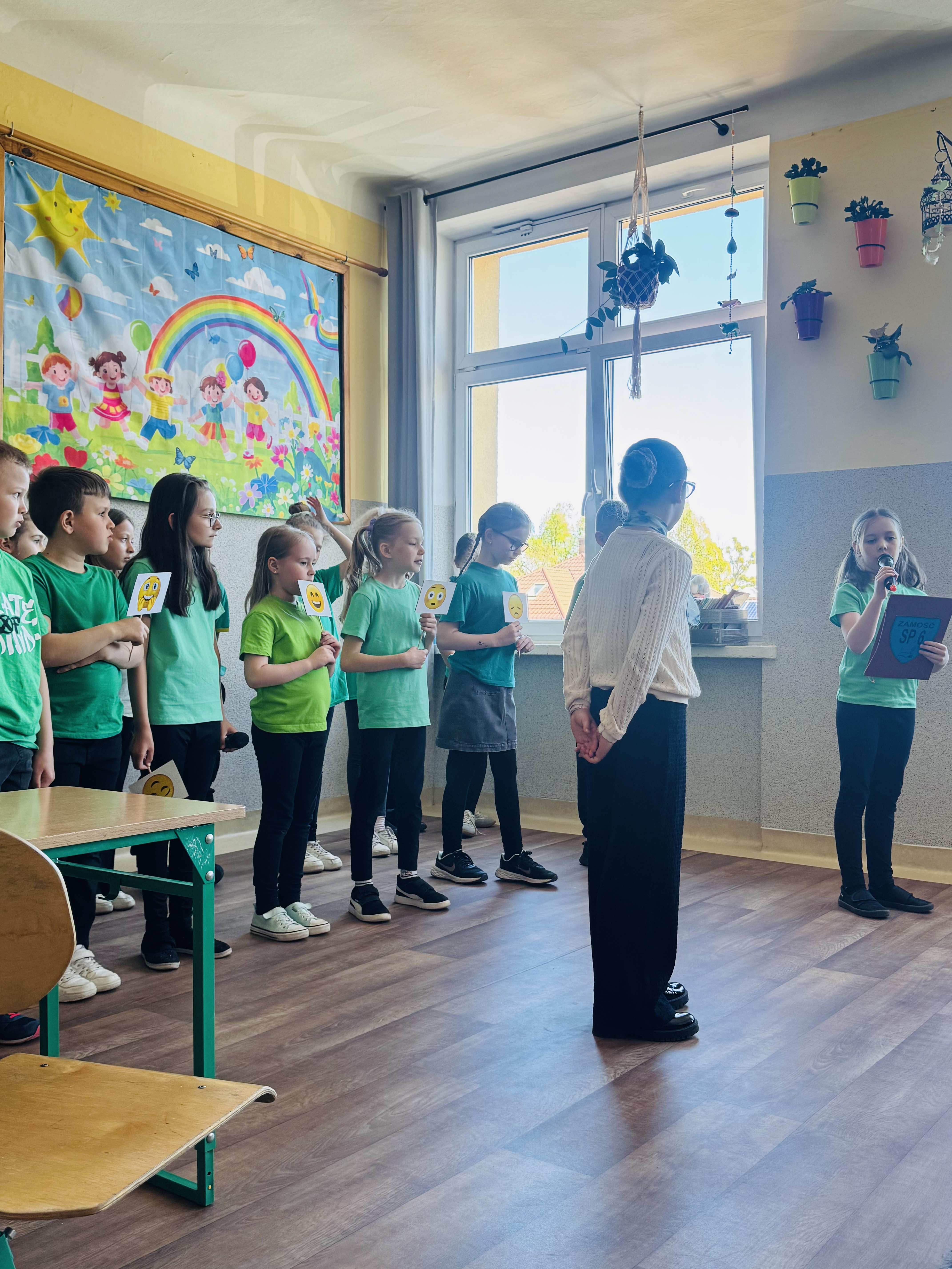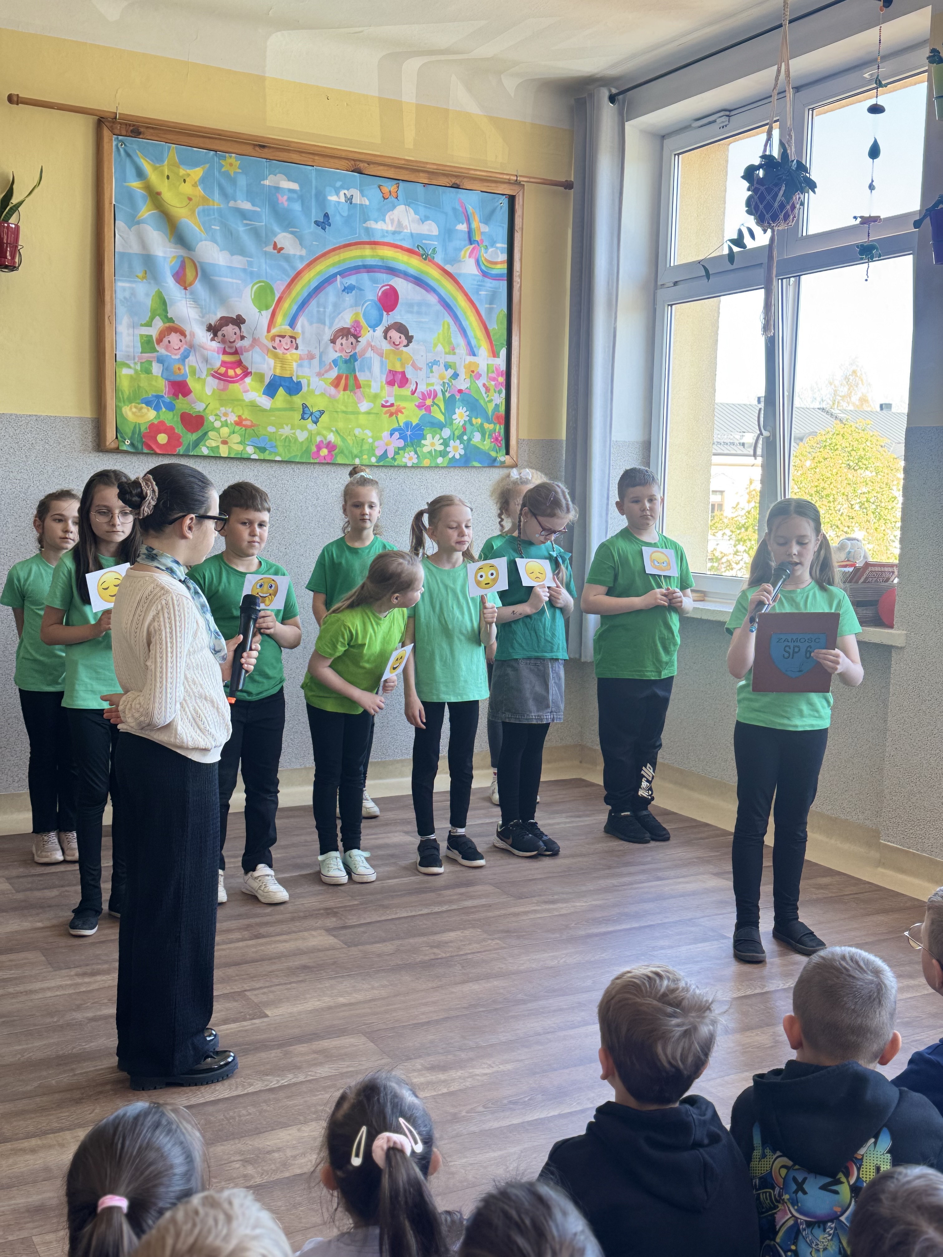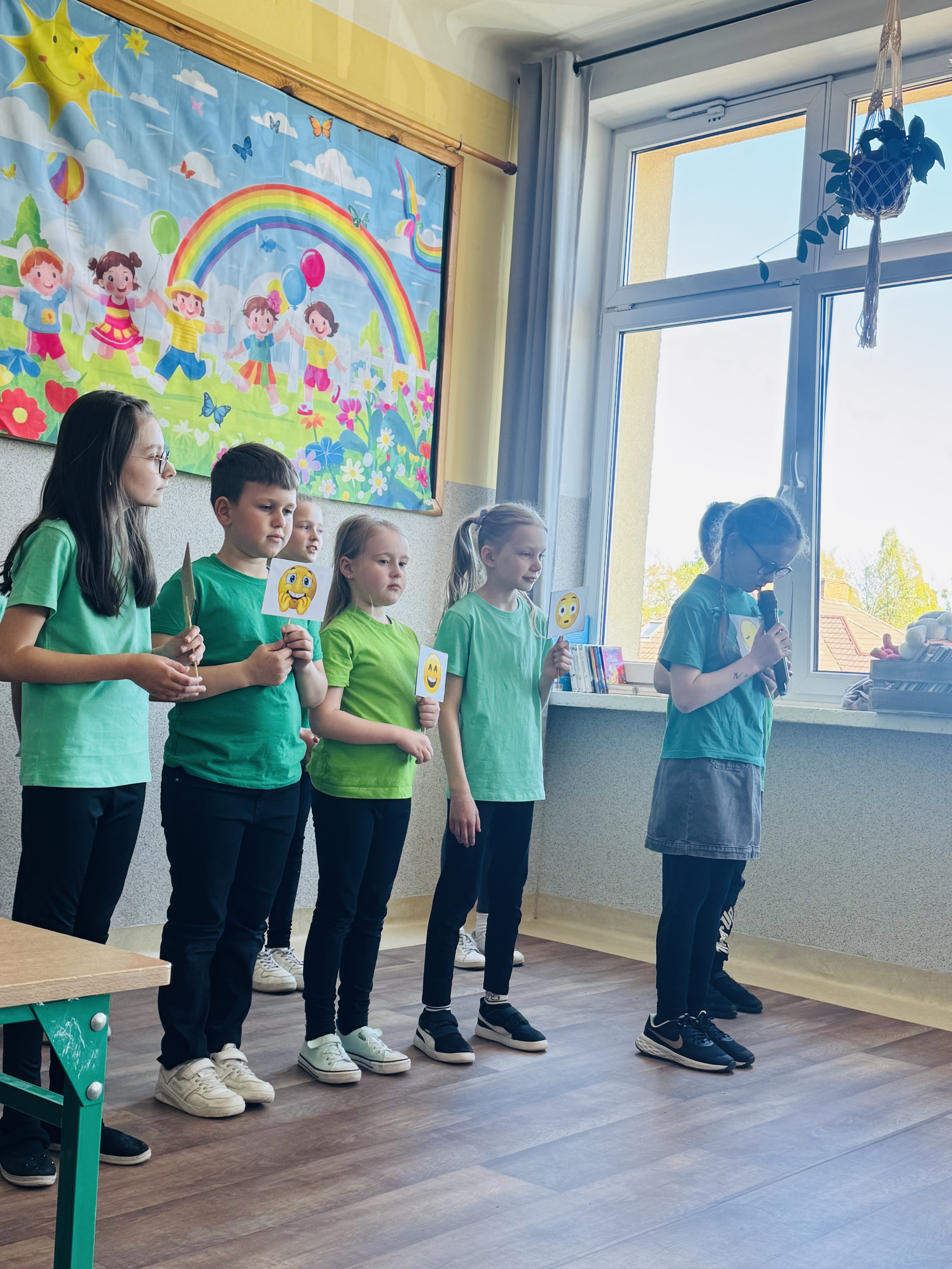 Dnia 27 kwietnia odbyło się przedstawienie pt. „Moje emocje” w ramach innowacji pedagogicznej, przygotowane przez Panie Katarzynę Hanulak oraz Małgorzatę Czajkowską. Występ został przygotowany przez klasę II B. Uczniowie zaprezentowali, jakie emocje towarzyszą nam w codziennym życiu – takie jak radość, smutek czy złość. Poprzez ruch, gest i mimikę w ciekawy sposób ukazali, czym są emocje oraz jak można je wyrażać. Program artystyczny wzbogacił również taniec przedstawiający różnorodność uczuć.