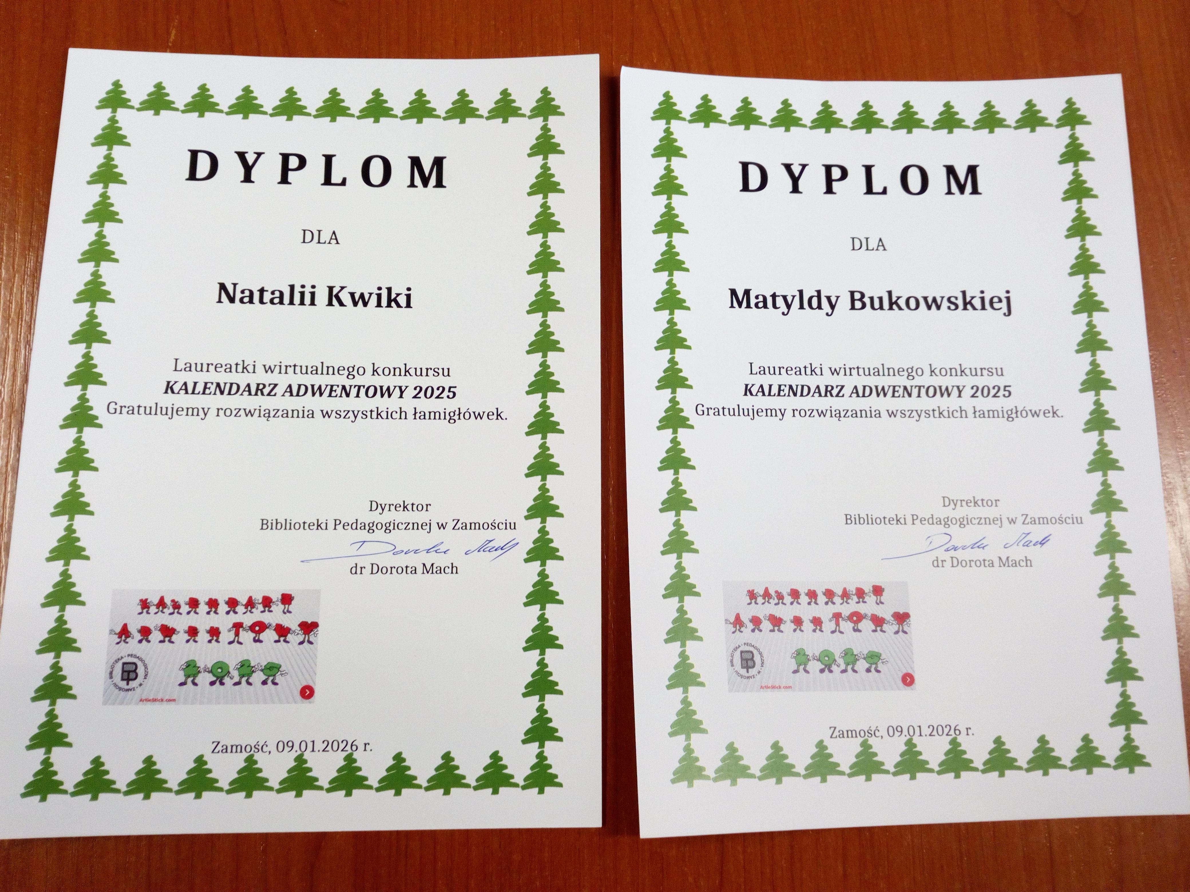 Miło nam poinformować, że uczennice klasy 7b: Matylda Bukowska oraz Natalia Kwika, otrzymały nagrody w Wirtualnym Kalendarzu Adwentowym, zorganizowanym przez Bibliotekę Pedagogiczną w Zamościu. Zabawa trwała od 1 do 24 grudnia. Każdego dnia należało otworzyć aktywne okienko i rozwiązać ukrytą łamigłówkę. Każda poprawna odpowiedź ujawniała litery, które utworzyły hasło.