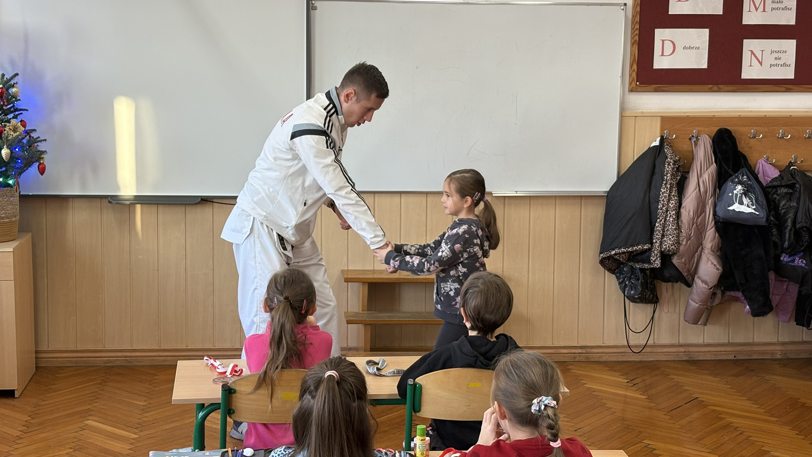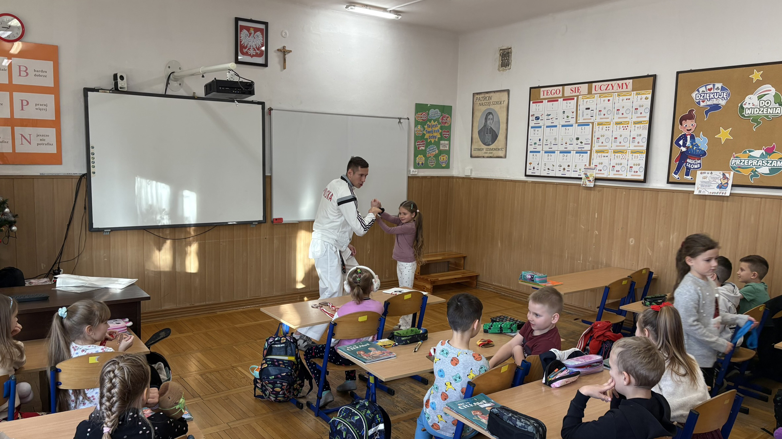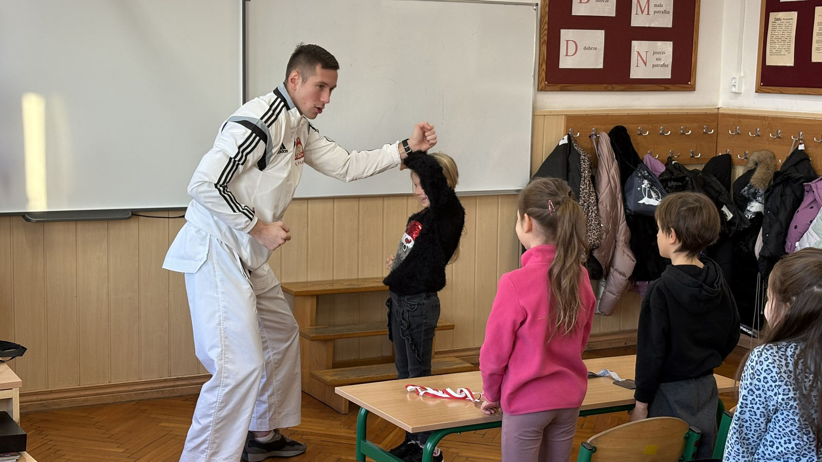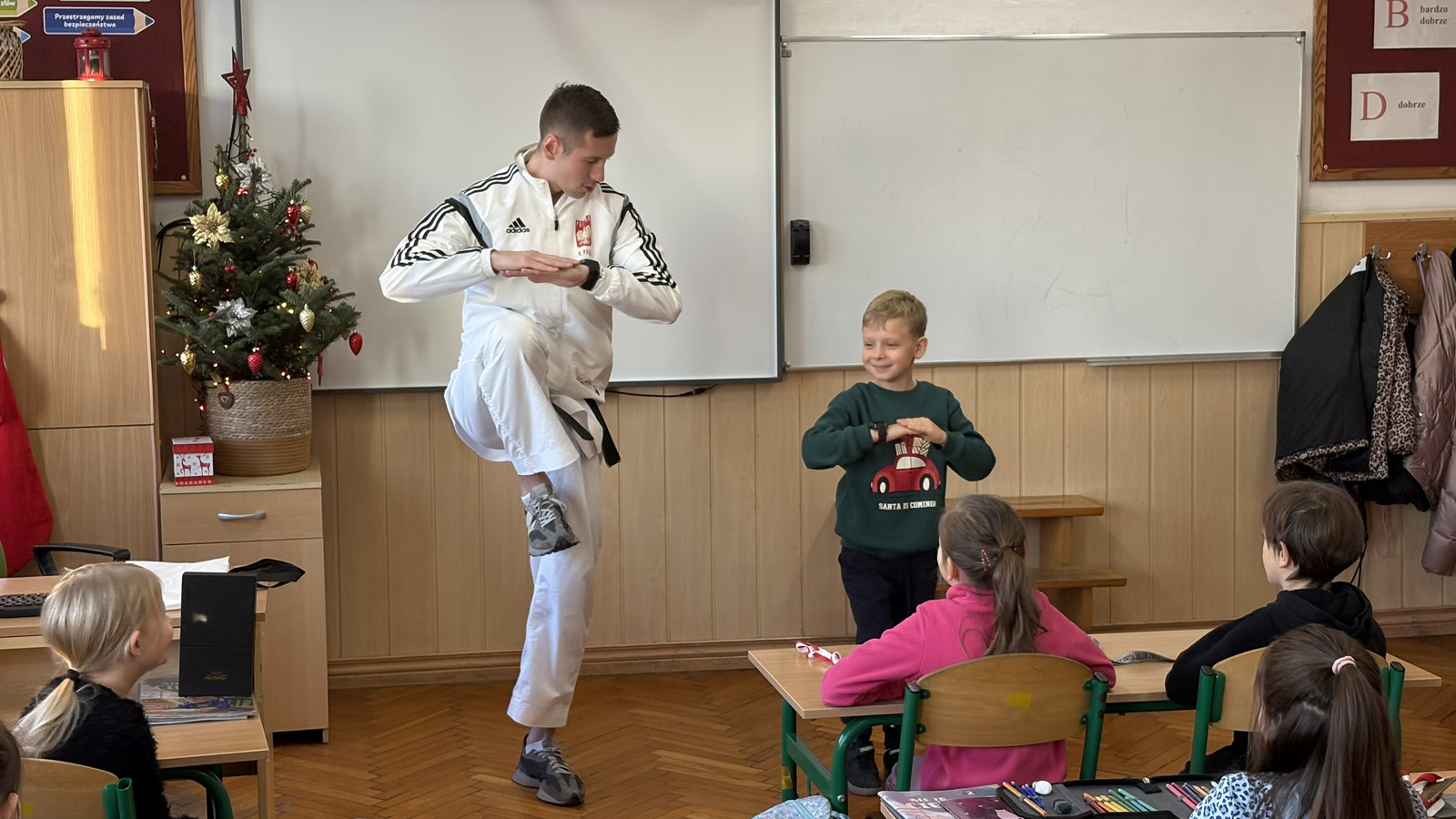 Kacper opowiedział o swojej przygodzie z karate, swoich dokonaniach. Przekazał uczestnikom spotkania, że najważniejszymi czynnikami tworzącymi sukces, nie tylko w sporcie, ale także w innych dziedzinach życia, są zaangażowanie, systematyczna praca, determinacja i nie poddawanie się w dążeniu do celu. Trening czyni mistrza i każdy może zostać mistrzem w swojej dziedzinie. Odpowiedział na wiele pytań zadawanych przez dzieci, przeprowadził krótki pokaz karate. Uczestnicy mogli także obejrzeć niektóre z medali naszego gościa zdobyte na arenie Mistrzostw Polski, czy Świata.