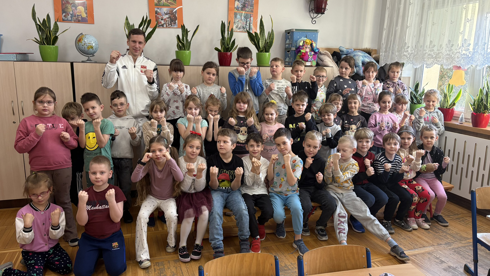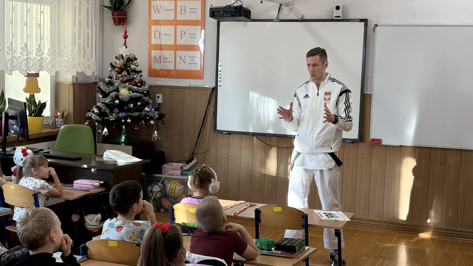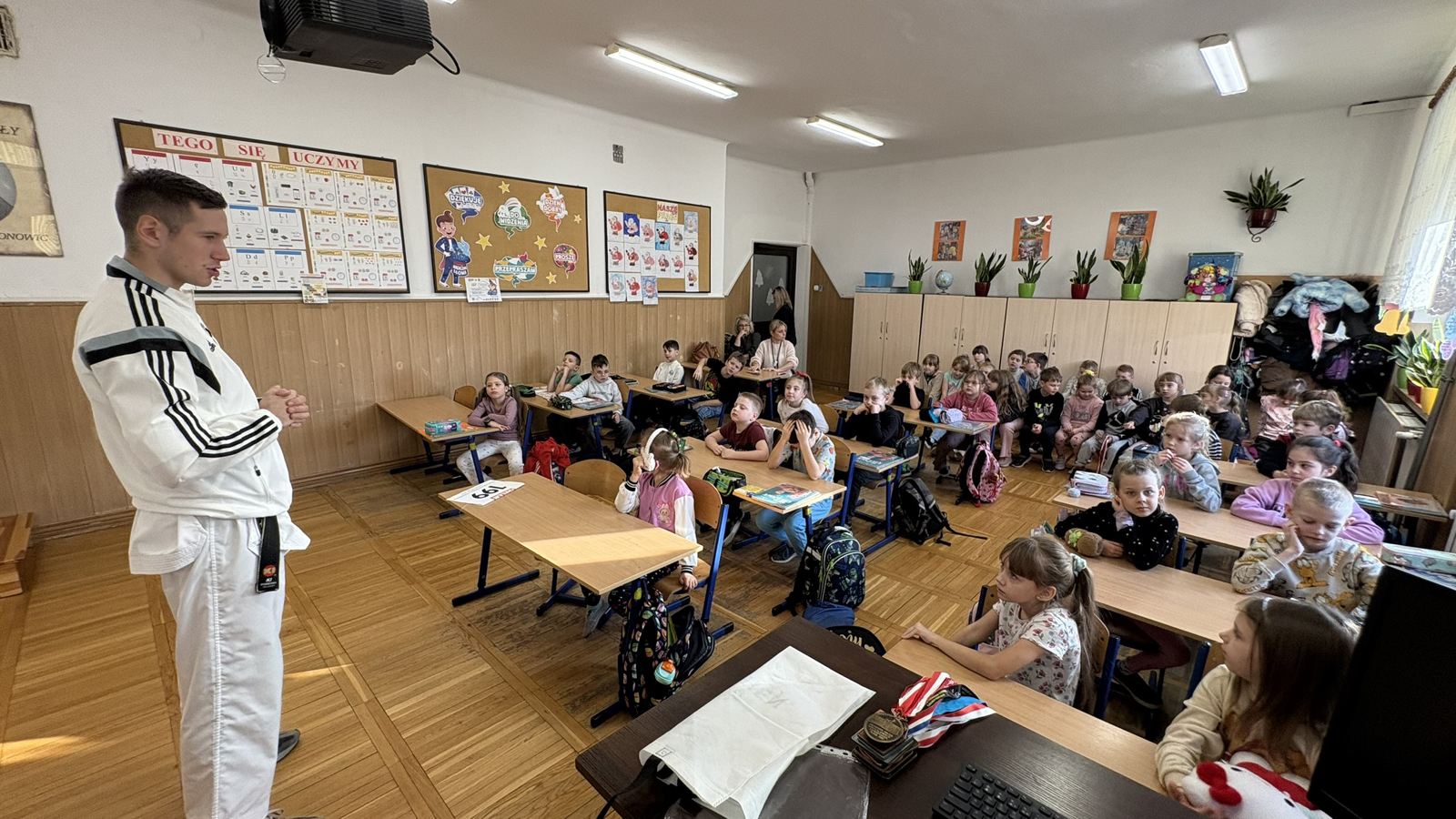 Kacper opowiedział o swojej przygodzie z karate, swoich dokonaniach. Przekazał uczestnikom spotkania, że najważniejszymi czynnikami tworzącymi sukces, nie tylko w sporcie, ale także w innych dziedzinach życia, są zaangażowanie, systematyczna praca, determinacja i nie poddawanie się w dążeniu do celu. Trening czyni mistrza i każdy może zostać mistrzem w swojej dziedzinie. Odpowiedział na wiele pytań zadawanych przez dzieci, przeprowadził krótki pokaz karate. Uczestnicy mogli także obejrzeć niektóre z medali naszego gościa zdobyte na arenie Mistrzostw Polski, czy Świata.