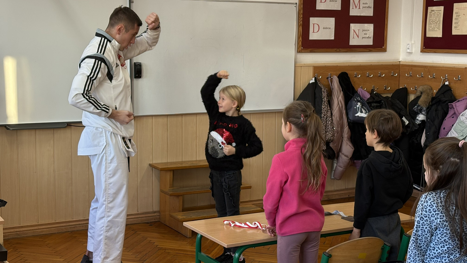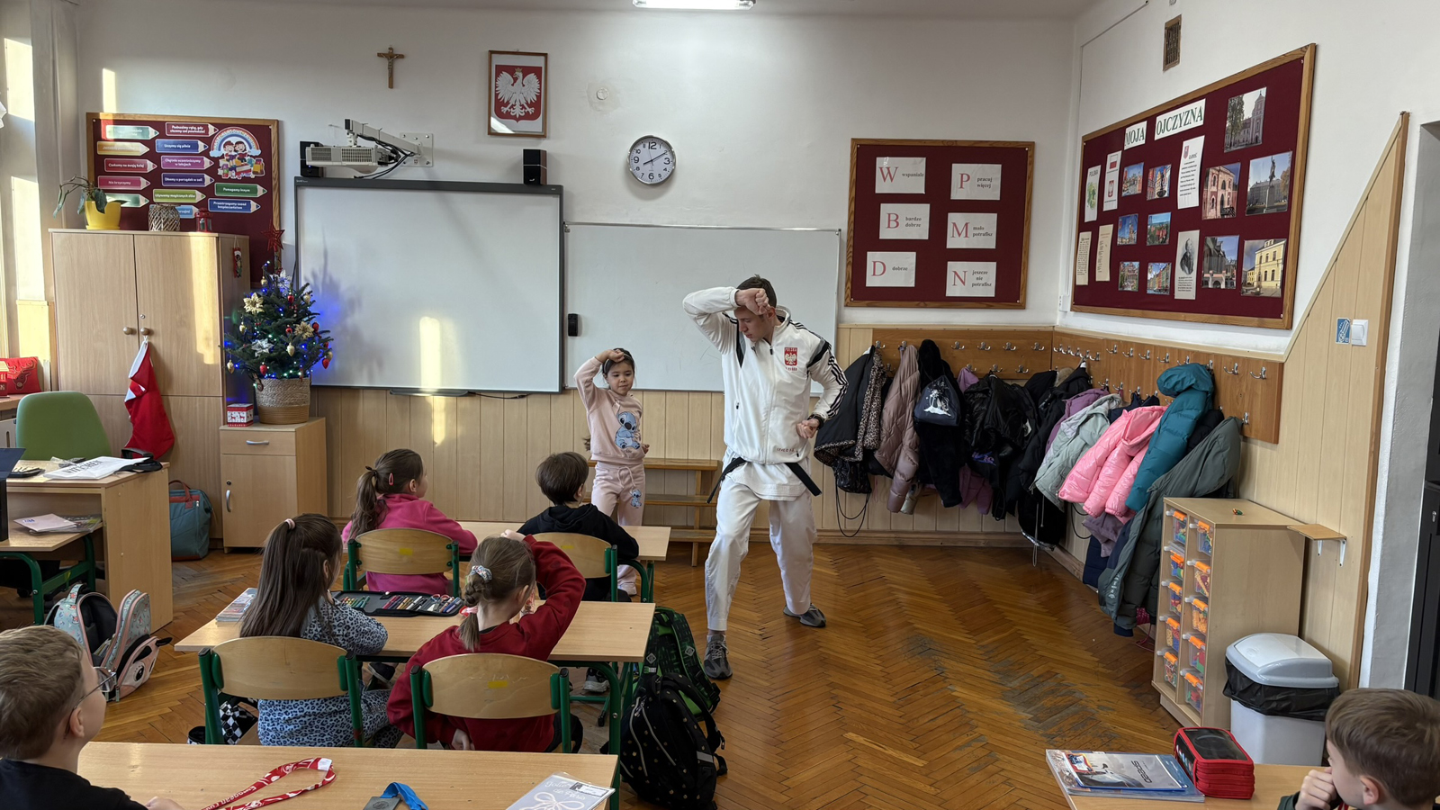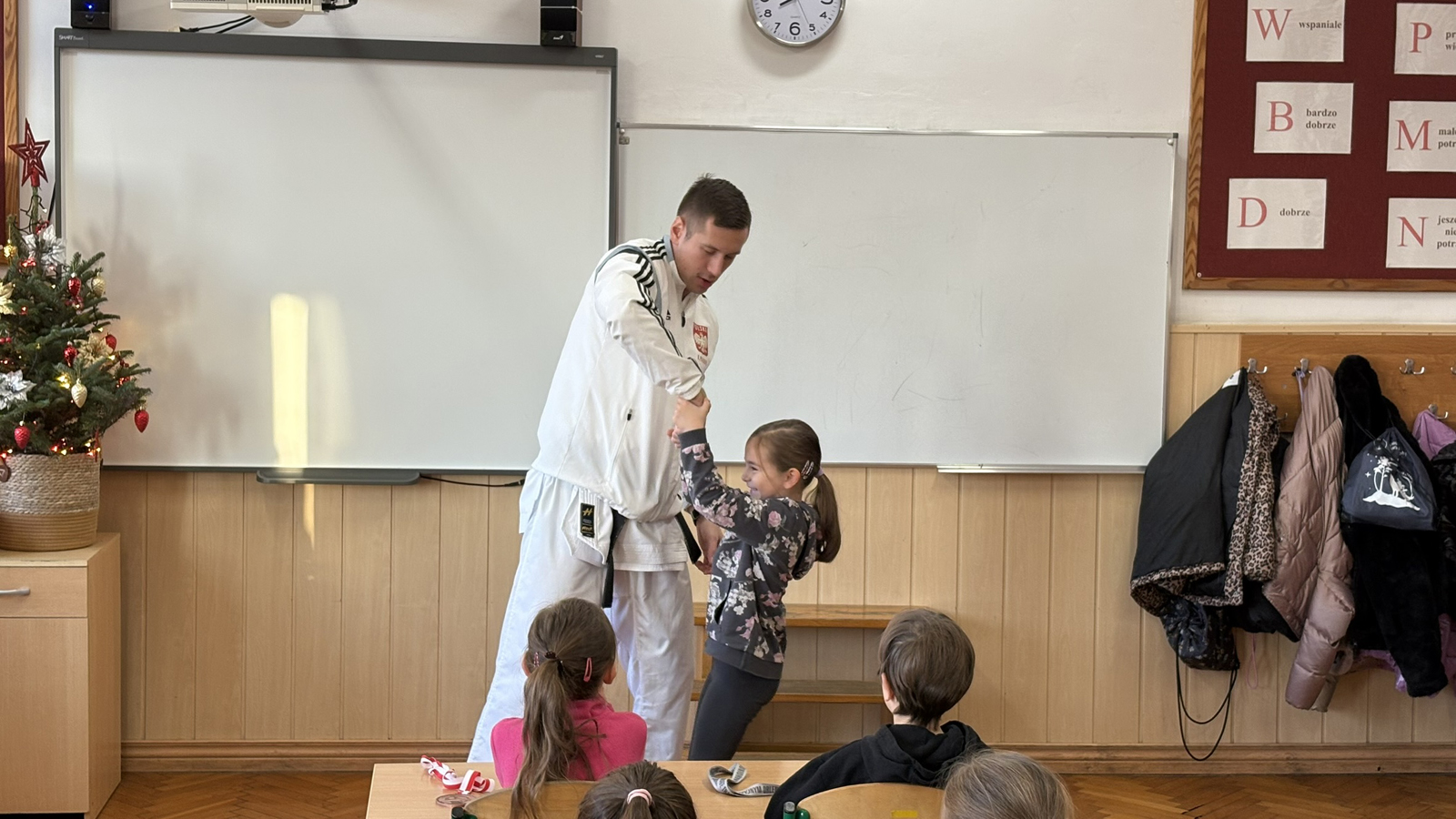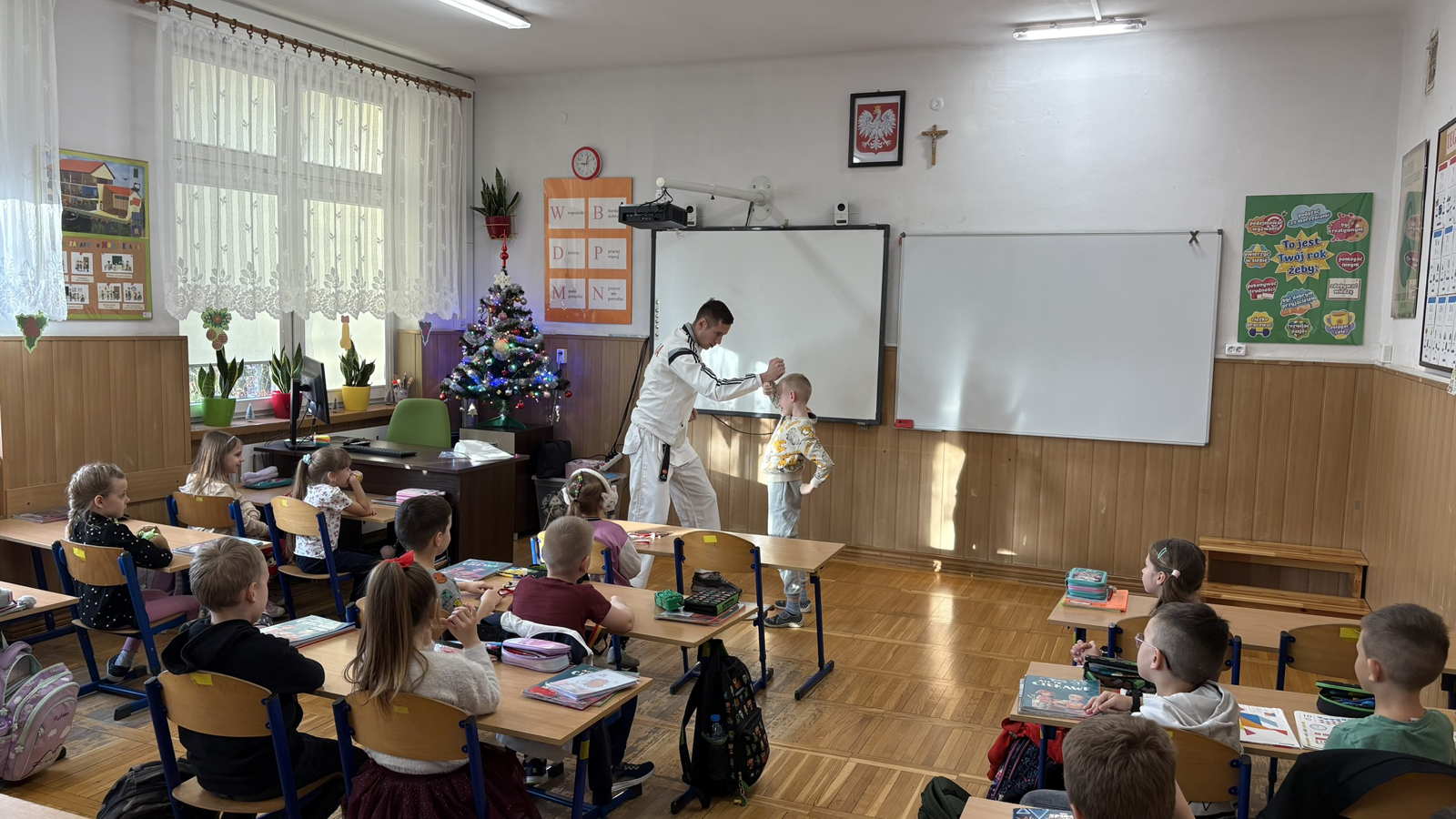 Kacper opowiedział o swojej przygodzie z karate, swoich dokonaniach. Przekazał uczestnikom spotkania, że najważniejszymi czynnikami tworzącymi sukces, nie tylko w sporcie, ale także w innych dziedzinach życia, są zaangażowanie, systematyczna praca, determinacja i nie poddawanie się w dążeniu do celu. Trening czyni mistrza i każdy może zostać mistrzem w swojej dziedzinie. Odpowiedział na wiele pytań zadawanych przez dzieci, przeprowadził krótki pokaz karate. Uczestnicy mogli także obejrzeć niektóre z medali naszego gościa zdobyte na arenie Mistrzostw Polski, czy Świata.