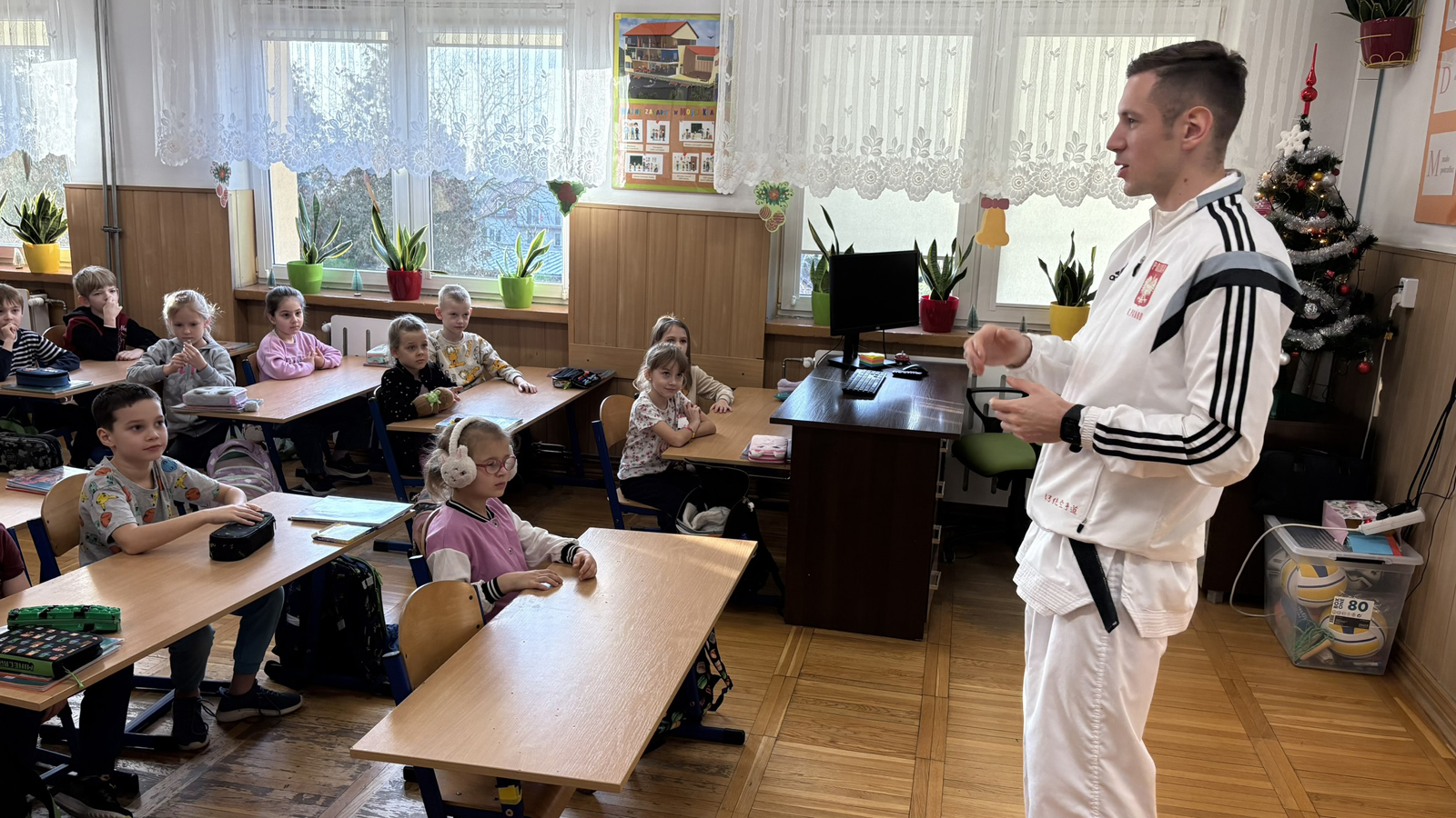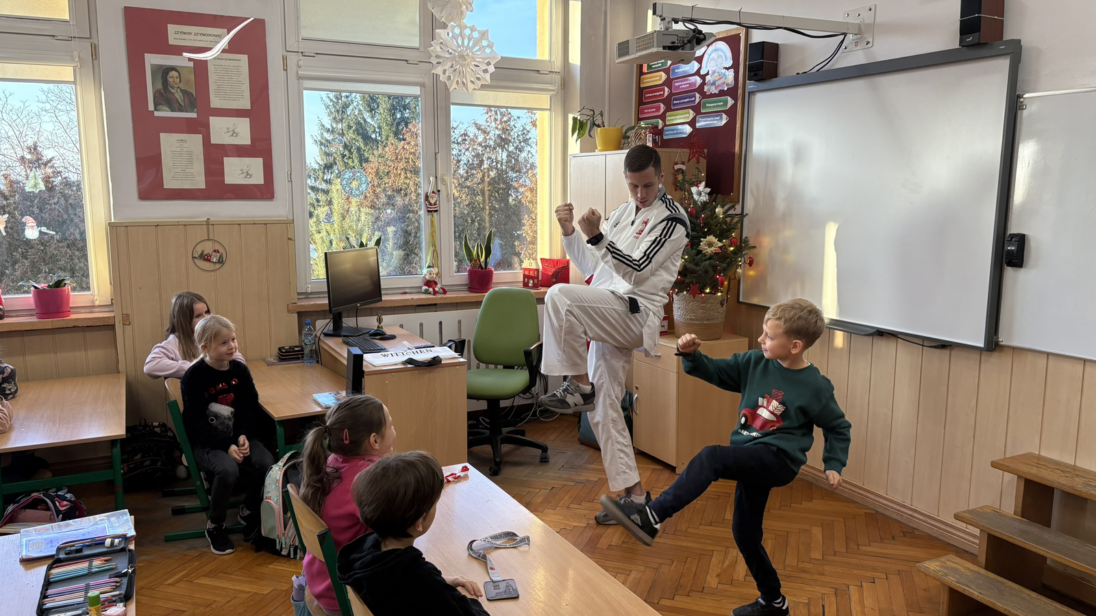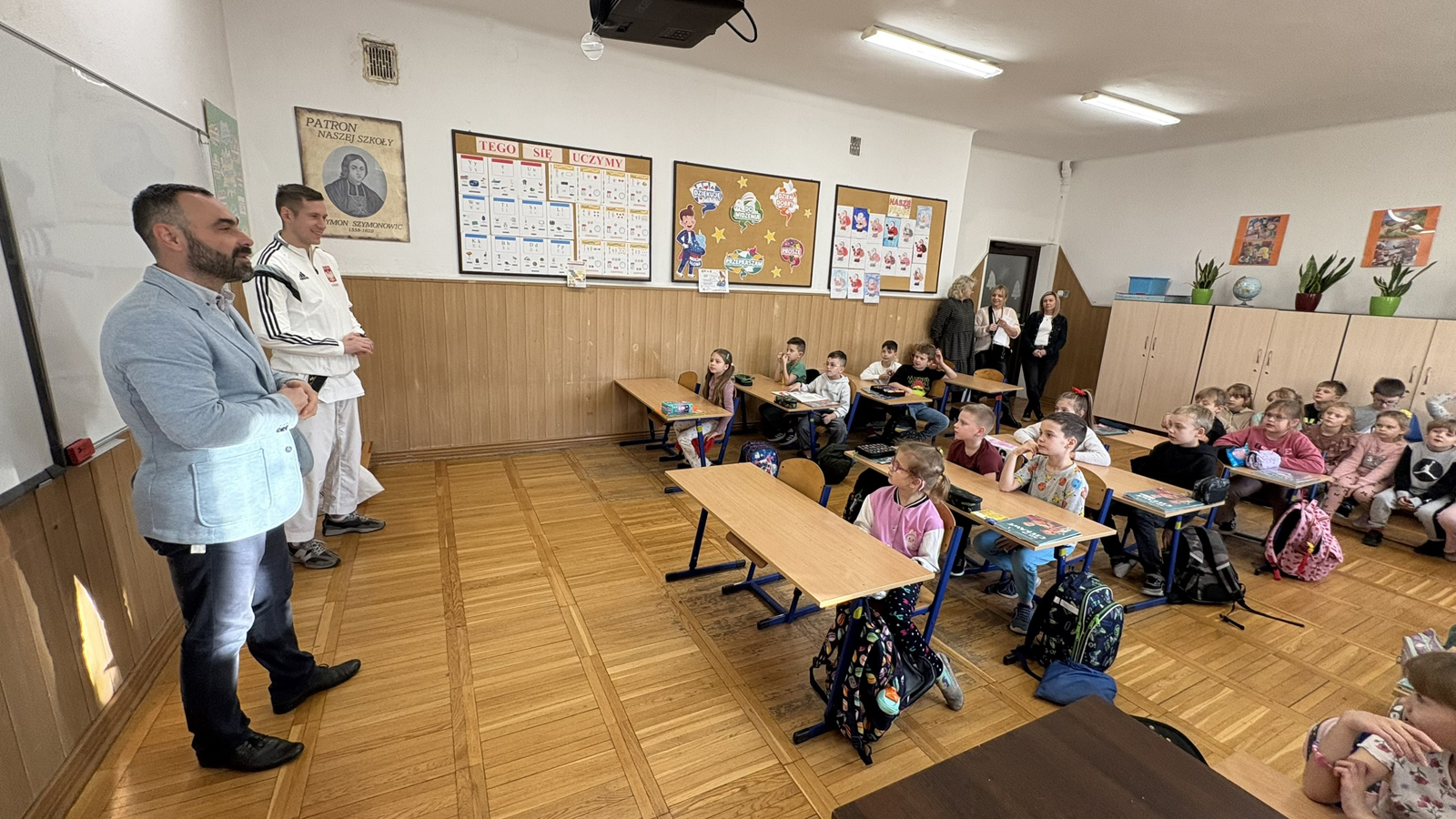 W klasach pierwszych pojawił się absolwent naszej szkoły, reprezentant kadry narodowej Karate Tradycyjnego, wielokrotny medalista Mistrzostw Polski, Europy oraz Świata – Kacper Pańko. Spotkania otworzył dyrektor szkoły Pan Sebastian Plewa. Przedstawił widowni składającej się z uczniów klas I naszej szkoły, którzy brali udział w programie „Mały Mistrz”, zaproszonego gościa.