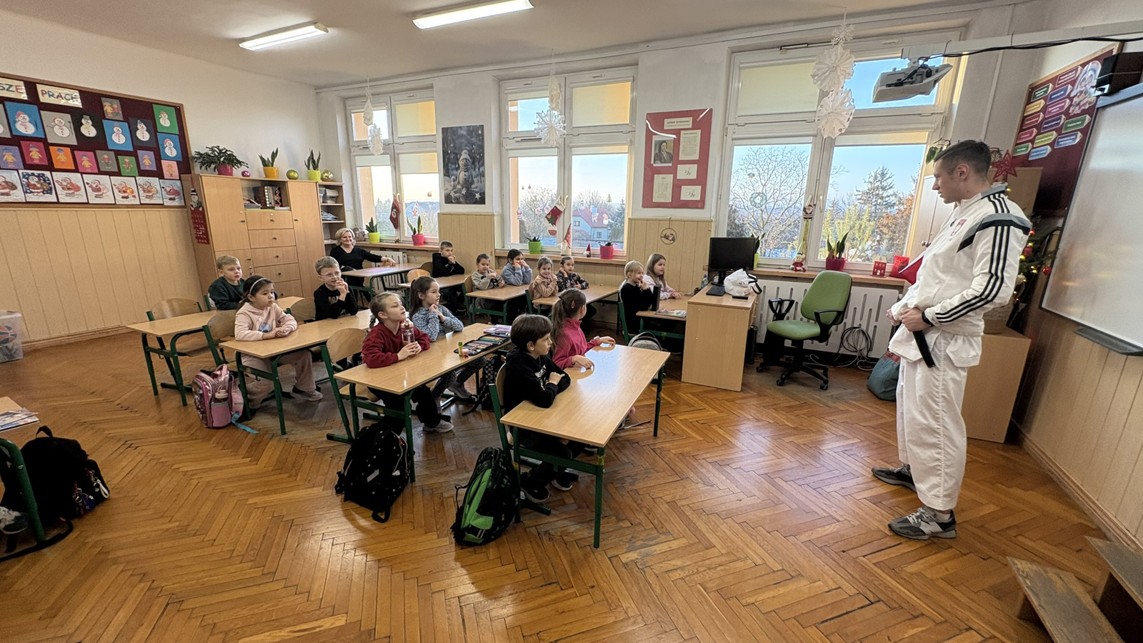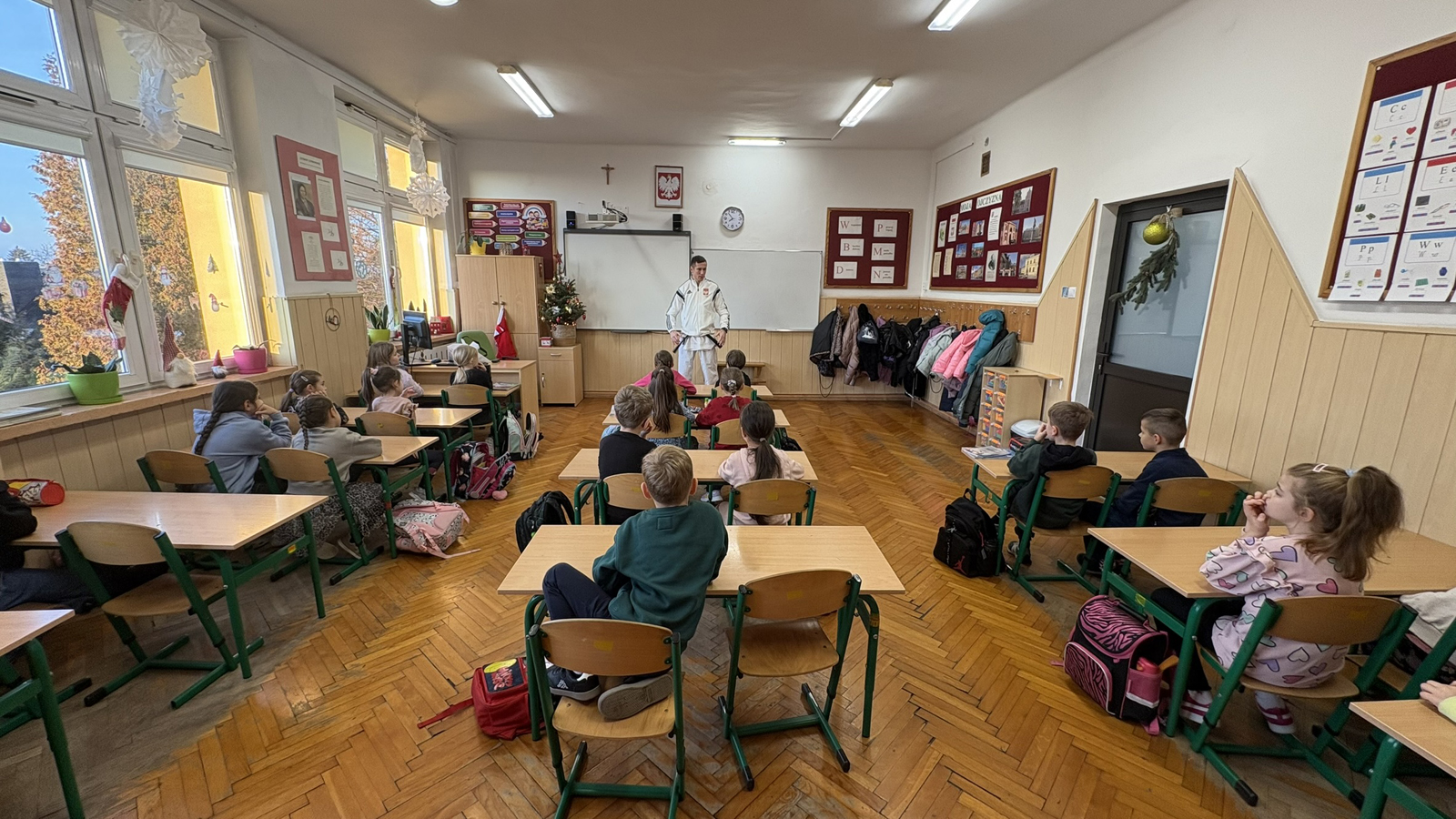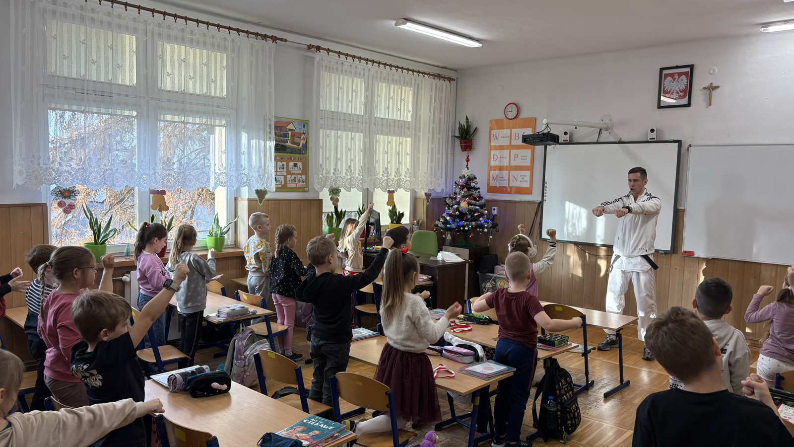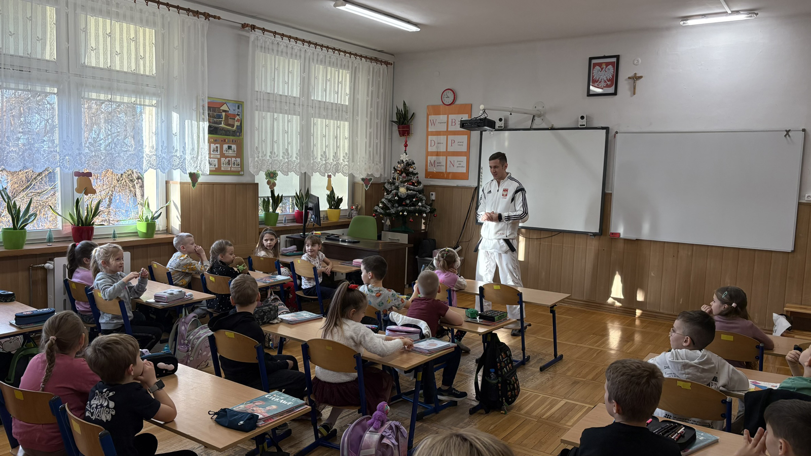 W klasach pierwszych pojawił się absolwent naszej szkoły, reprezentant kadry narodowej Karate Tradycyjnego, wielokrotny medalista Mistrzostw Polski, Europy oraz Świata – Kacper Pańko. Spotkania otworzył dyrektor szkoły Pan Sebastian Plewa. Przedstawił widowni składającej się z uczniów klas I naszej szkoły, którzy brali udział w programie „Mały Mistrz”, zaproszonego gościa.