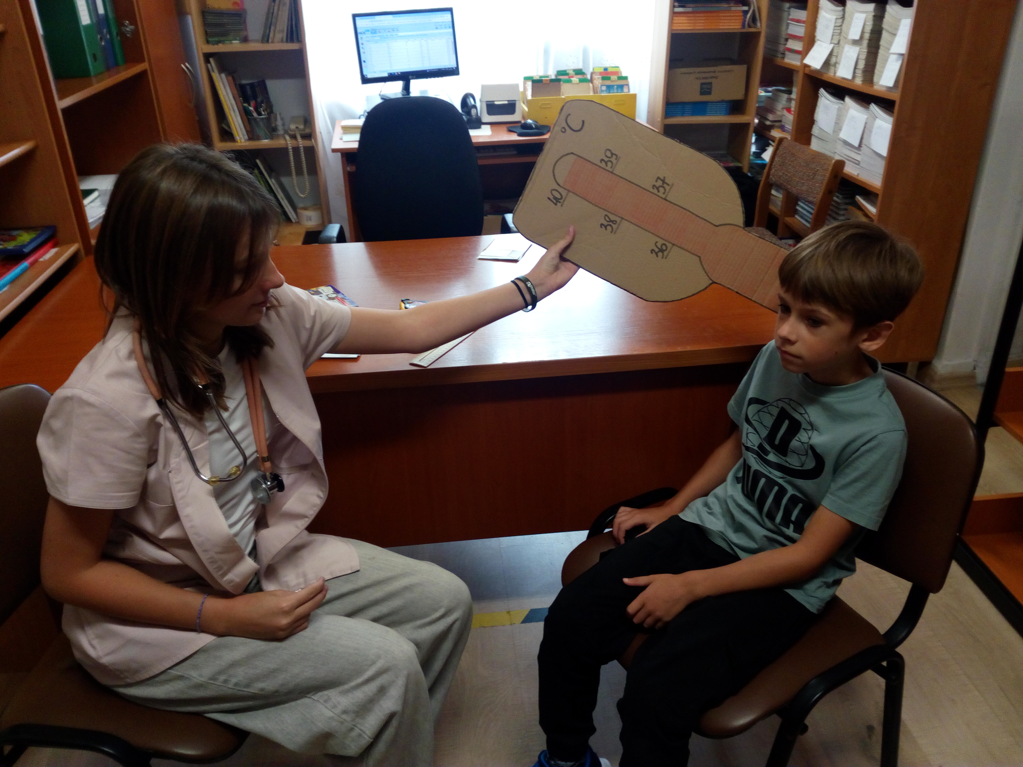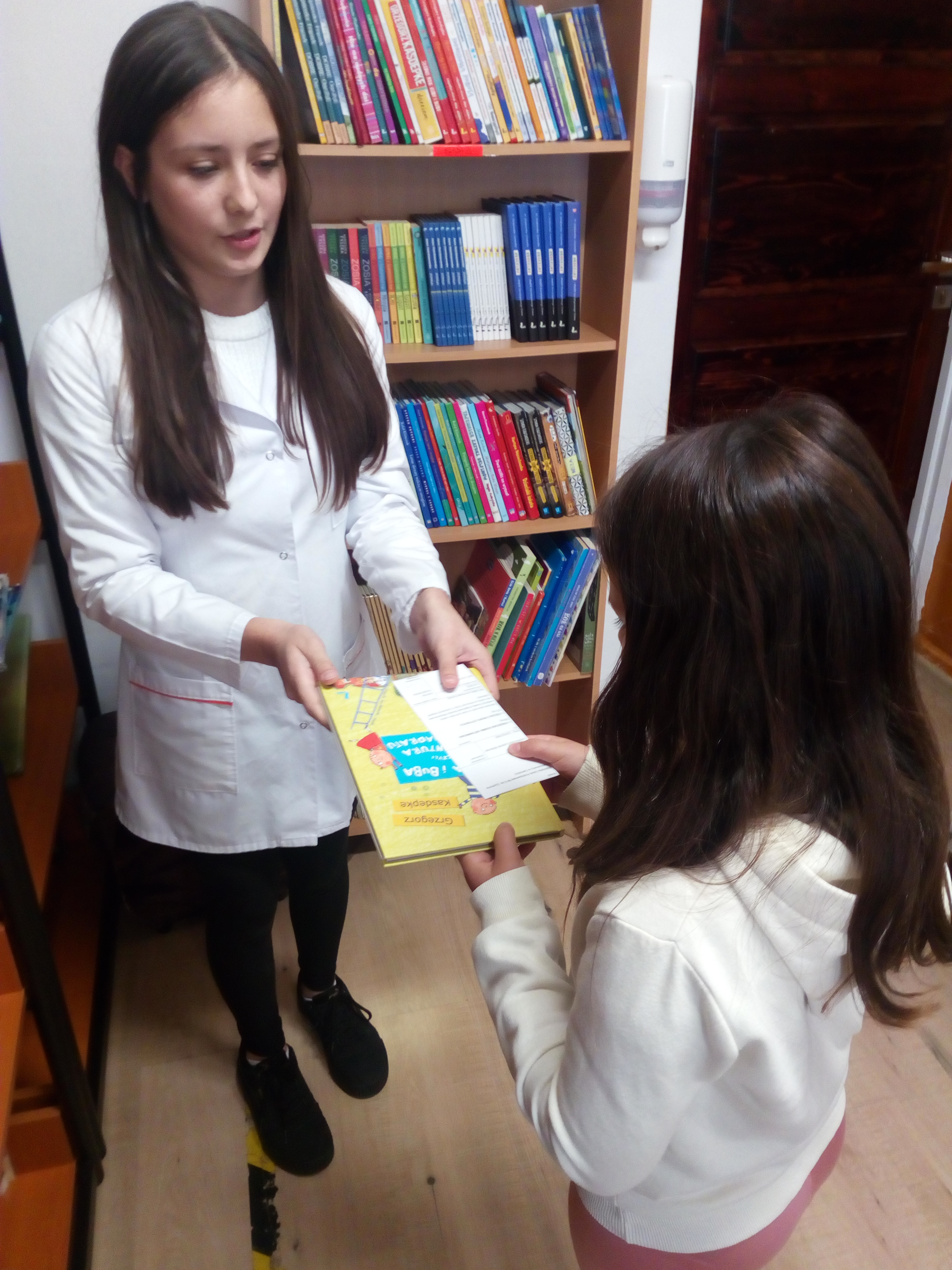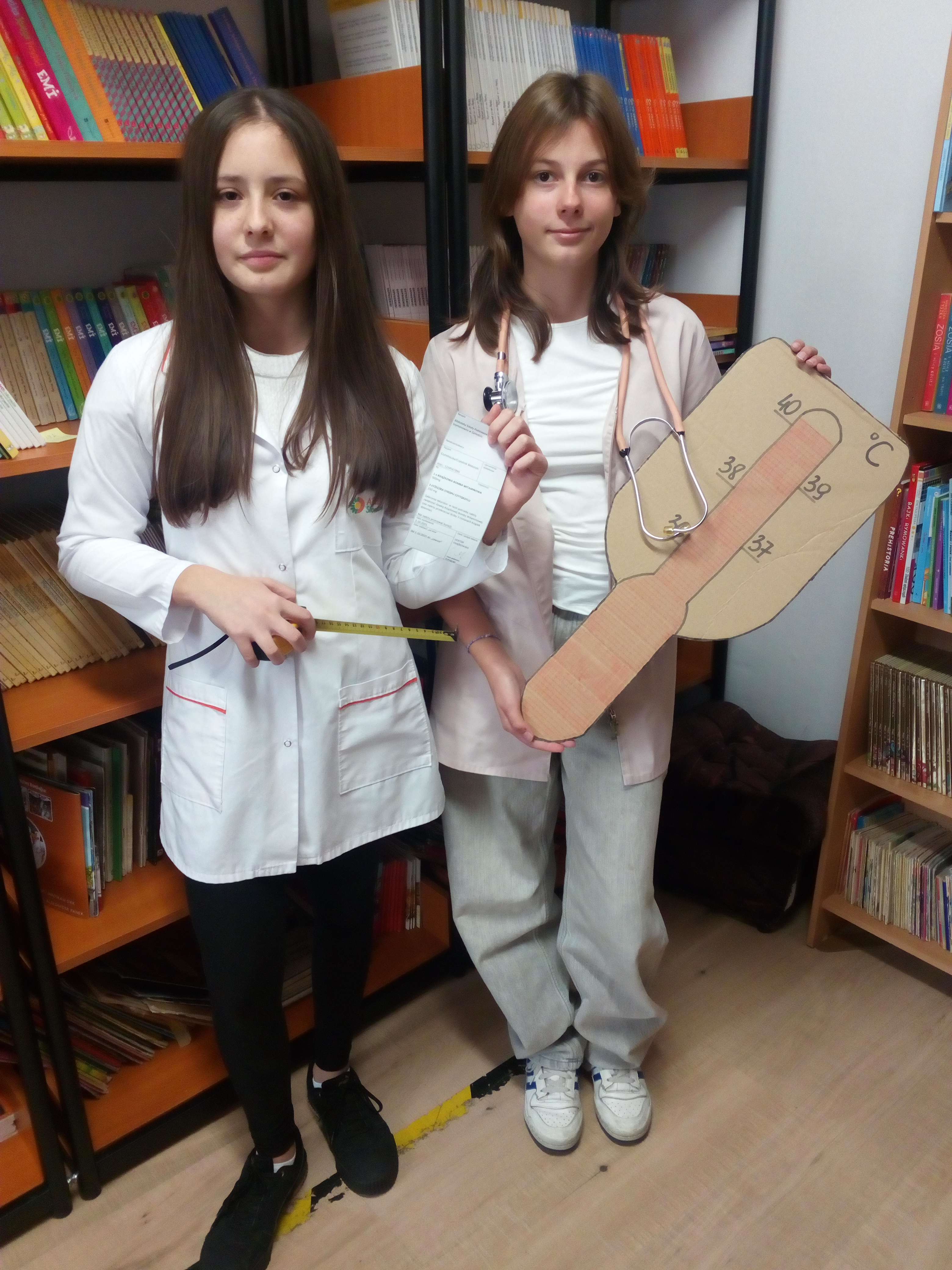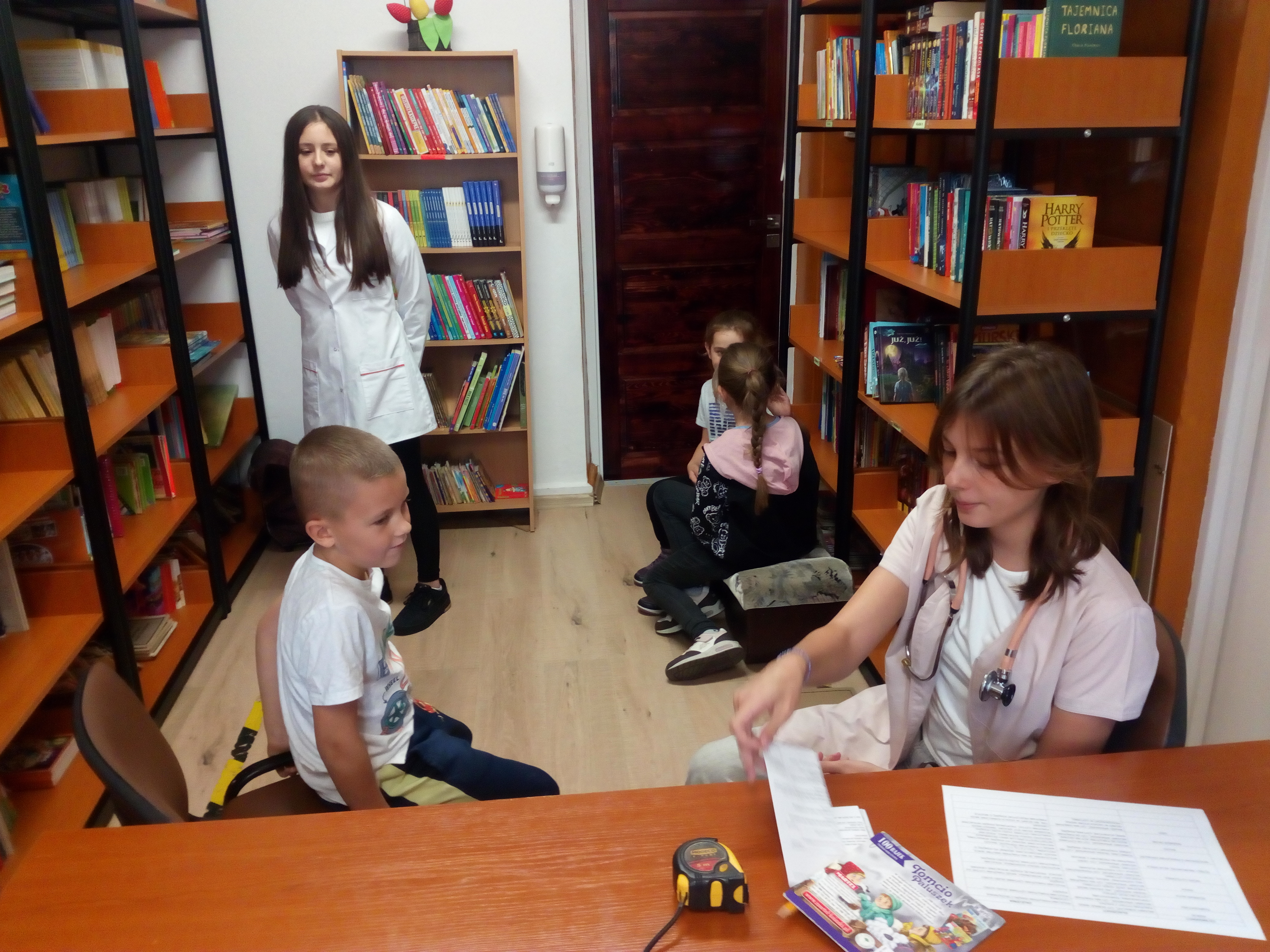 Akcja w stylu „na poważnie, ale z przymrużeniem oka” przyciÄ…gnęła do biblioteki rzeszÄ™ maÅ‚ych czytelników. Z okazji MiÄ™dzynarodowego MiesiÄ…ca Bibliotek Szkolnych, razem z uczennicami klasy 7a zorganizowaÅ‚yÅ›my prawdziwÄ… przychodniÄ™ czytelniczÄ…. Pani doktor (w tej roli wystÄ…piÅ‚a Magdalena WoÅ‚och) badaÅ‚a wszystko, co najważniejsze dla książkoholika: wzrok (czy dobrze widzi z daleka), rozmiar dÅ‚oni (czy da radÄ™ uchwycić czytanÄ… książkÄ™), rozmiar buta (jak daleko może zajść dziÄ™ki czytaniu), temperaturÄ™ czytelniczego zapaÅ‚u, a nawet wÅ‚osy na gÅ‚owie (czy nie bÄ™dÄ… siÄ™ jeżyć podczas czytania). A wszystko to w kontekÅ›cie „stopnia zaczytania”. Po przeprowadzonym badaniu pani doktor Książkowska wystawiaÅ‚a diagnozÄ™ wraz zaleceniami i receptÄ…. Zalecenia te byÅ‚y różne i bardzo indywidualne: na szumy w uszach – książki o muzyce, na sÅ‚aby wzrok – z dużą czcionkÄ…, a na ospaÅ‚ość – detektywistyczne lub maÅ‚y kryminaÅ‚ek. Każdy pacjent mógÅ‚ od razu zrealizować swojÄ… receptÄ™ u pani aptekarki ZakÅ‚adki (w rolÄ™ wcieliÅ‚a siÄ™ Nicola Parkitny). Do tego byÅ‚y rekwizyty: lekarskie kitle, stetoskop oraz wÅ‚asnorÄ™cznie wykonana waga i termometr.