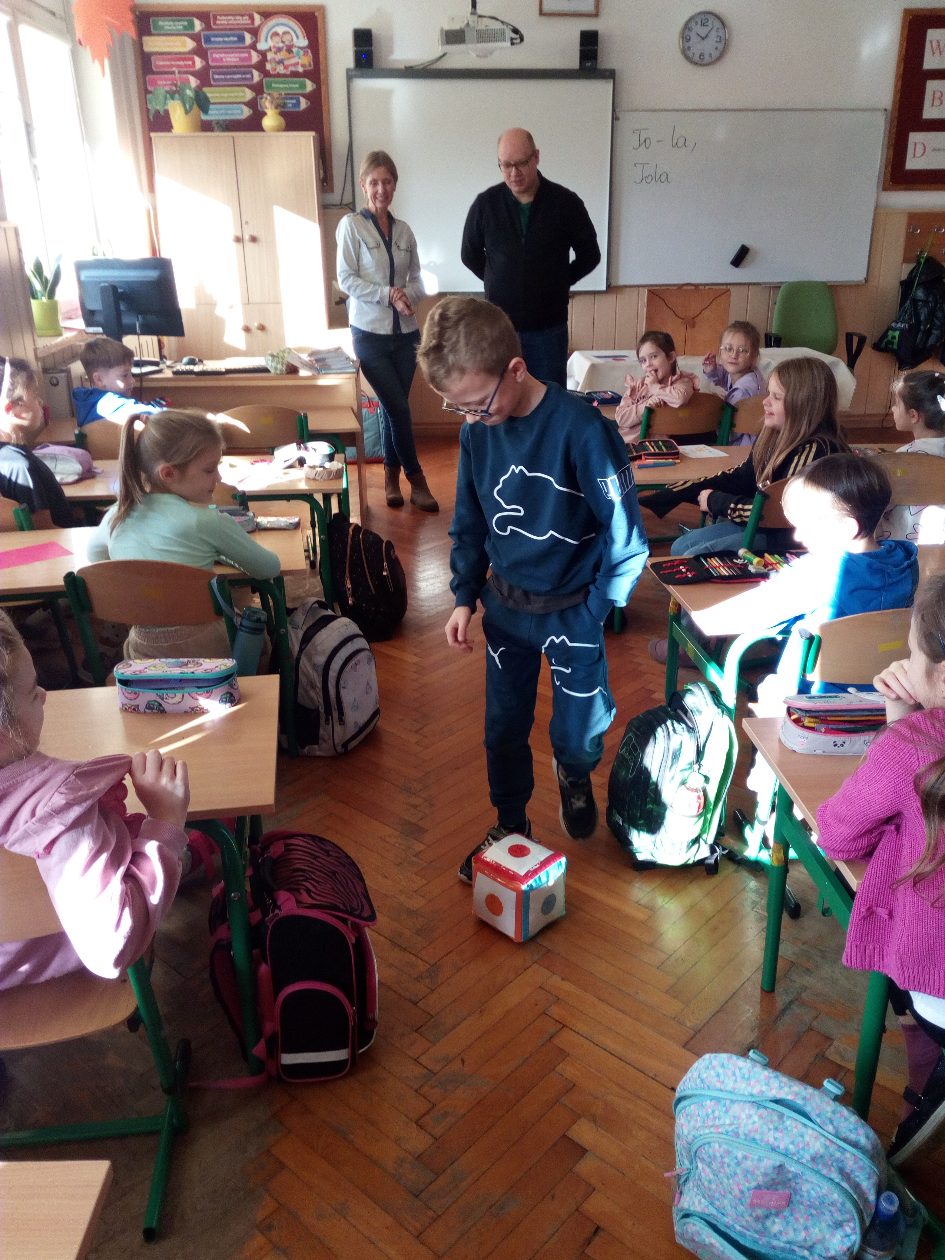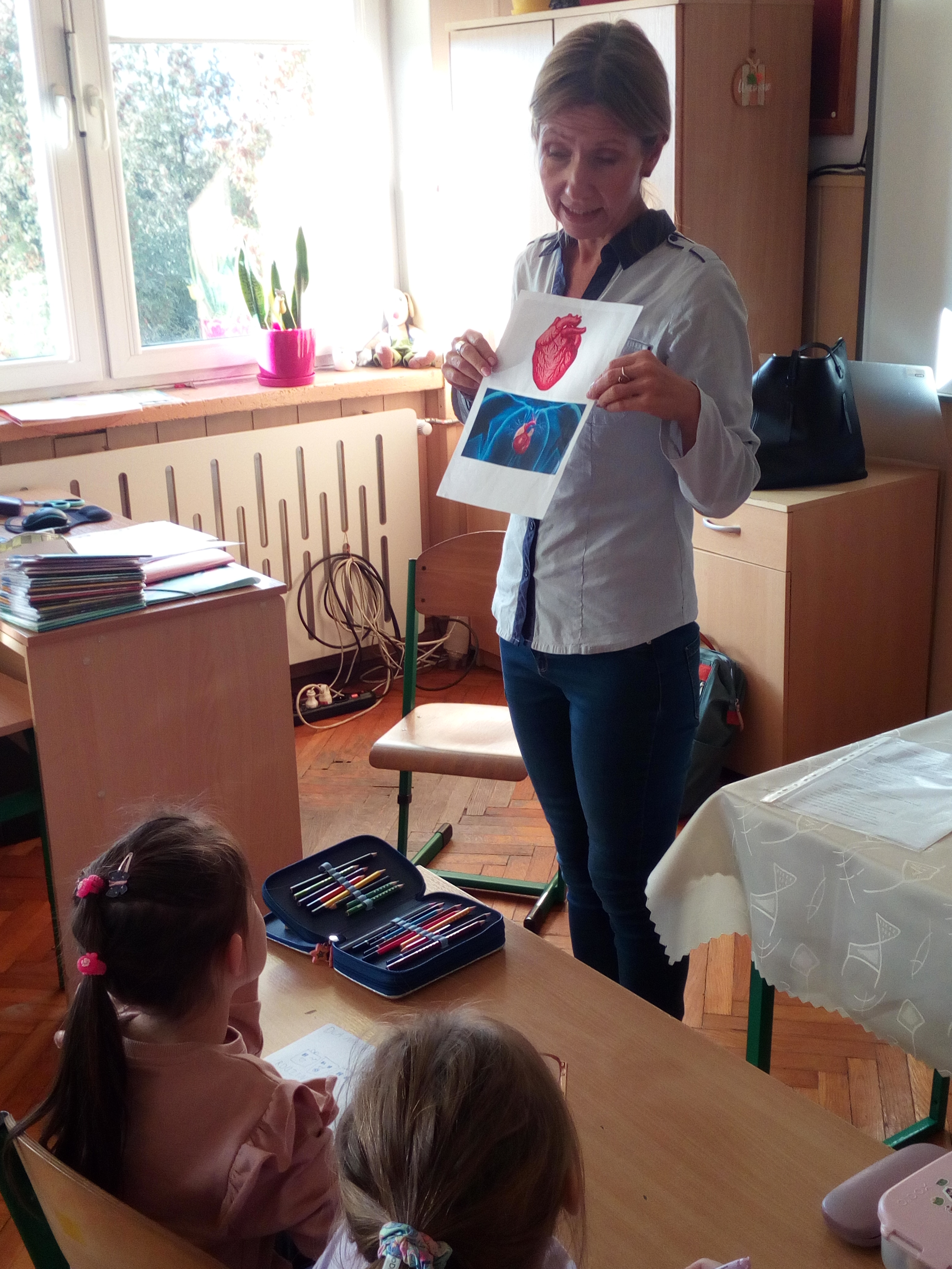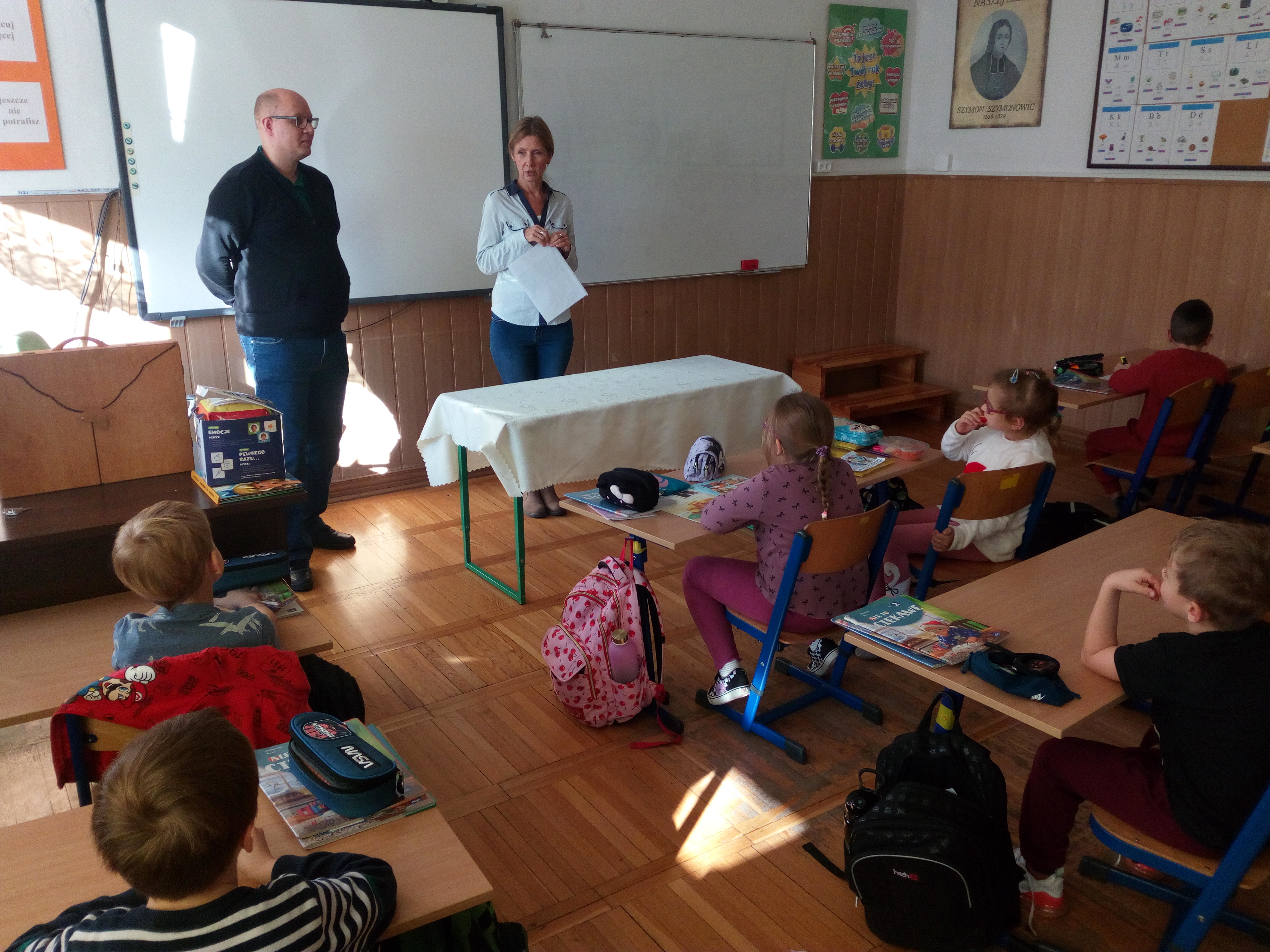 Dzieci z zaciekawieniem słuchały historii o przyjaźni, empatii, trosce o innych i o swoje zdrowie, podziwiając przy tym piękne, kolorowe ilustracje towarzyszące opowieści. Ważnym elementem spotkania była rozmowa o tym, jak dbać o zdrowie, jakie znaczenie mają ruch, sen i zdrowe odżywianie. Uczniowie nazywali też uczucia, przy pomocy rzucanej kostki do gry.