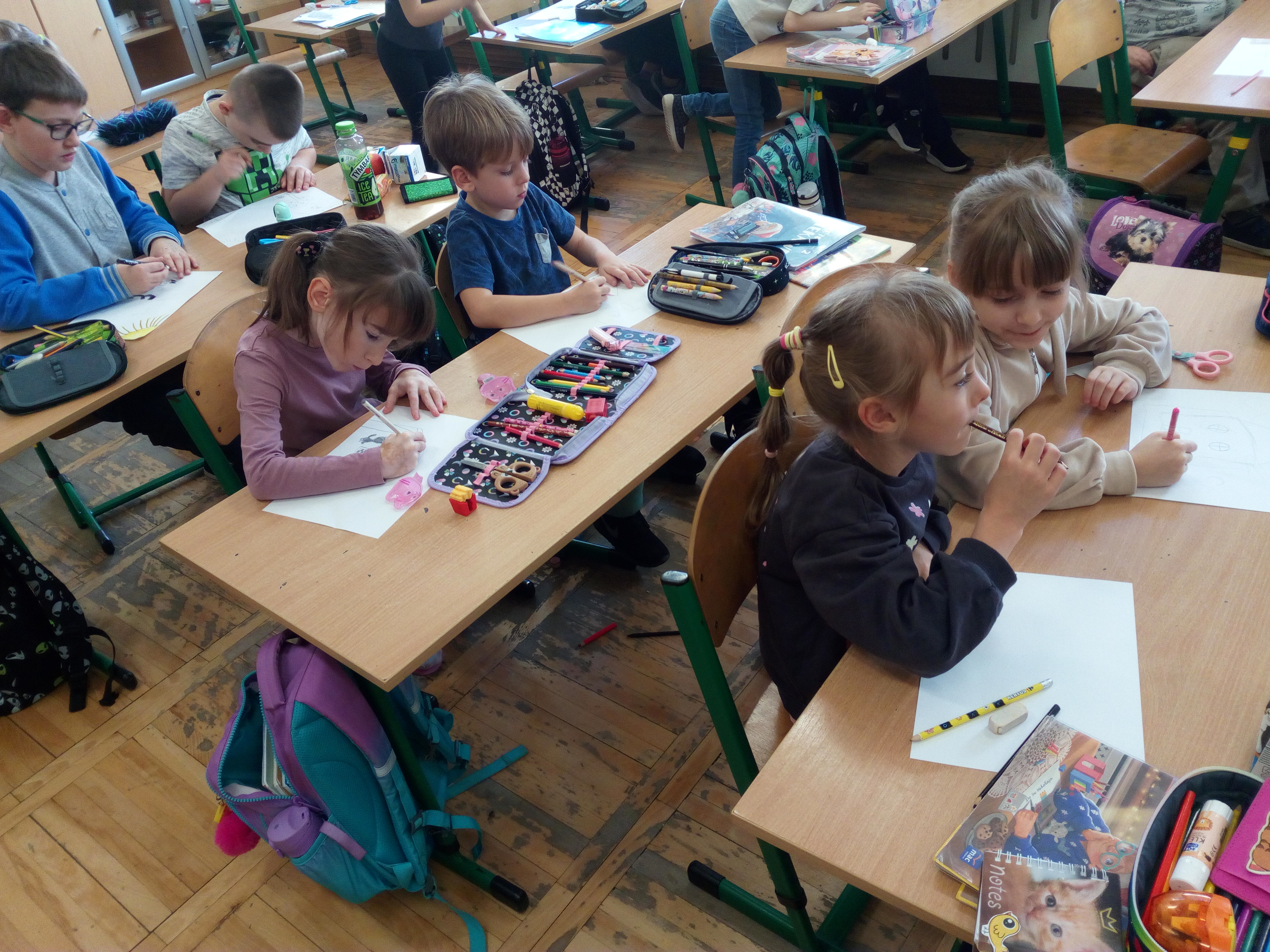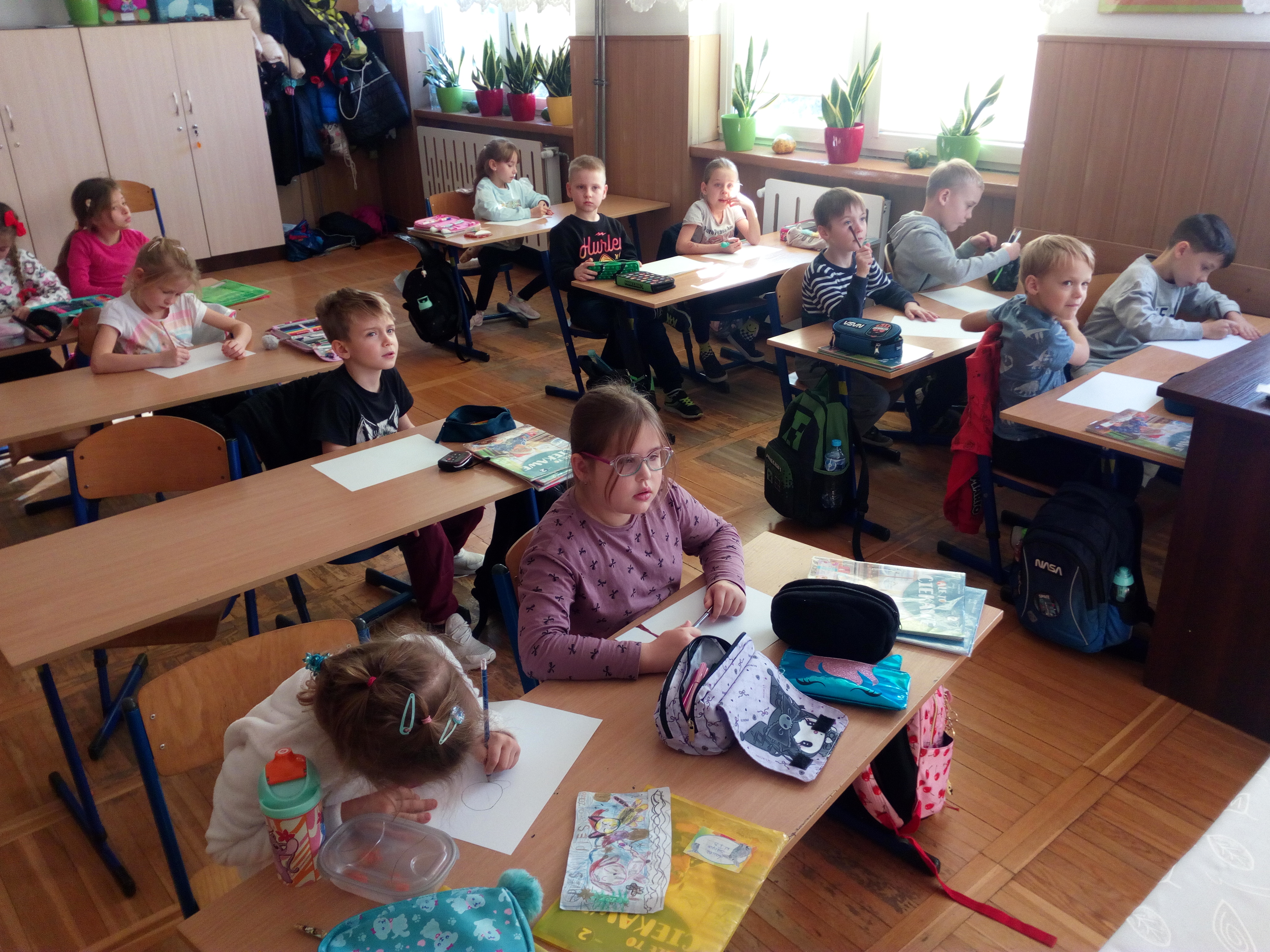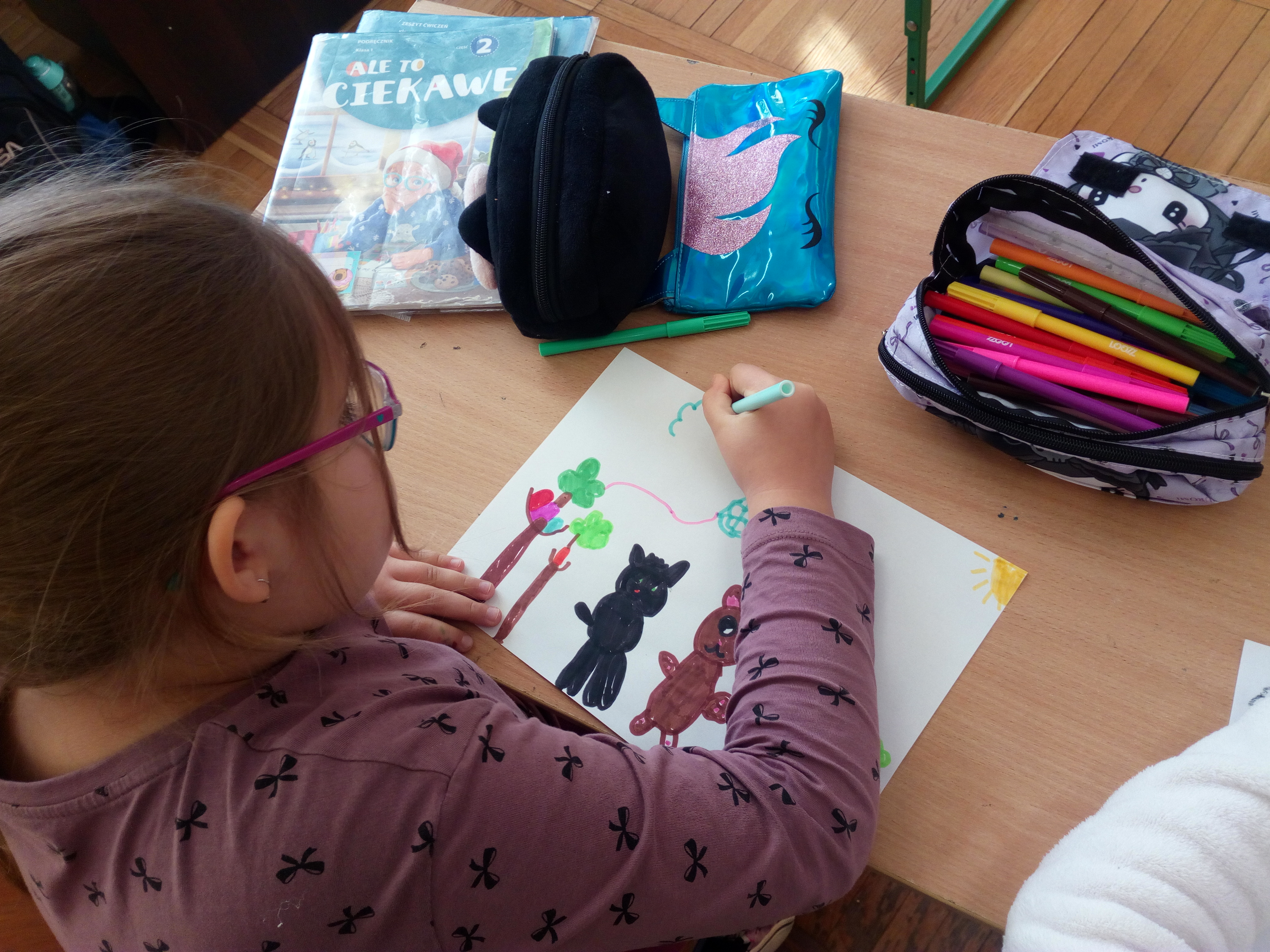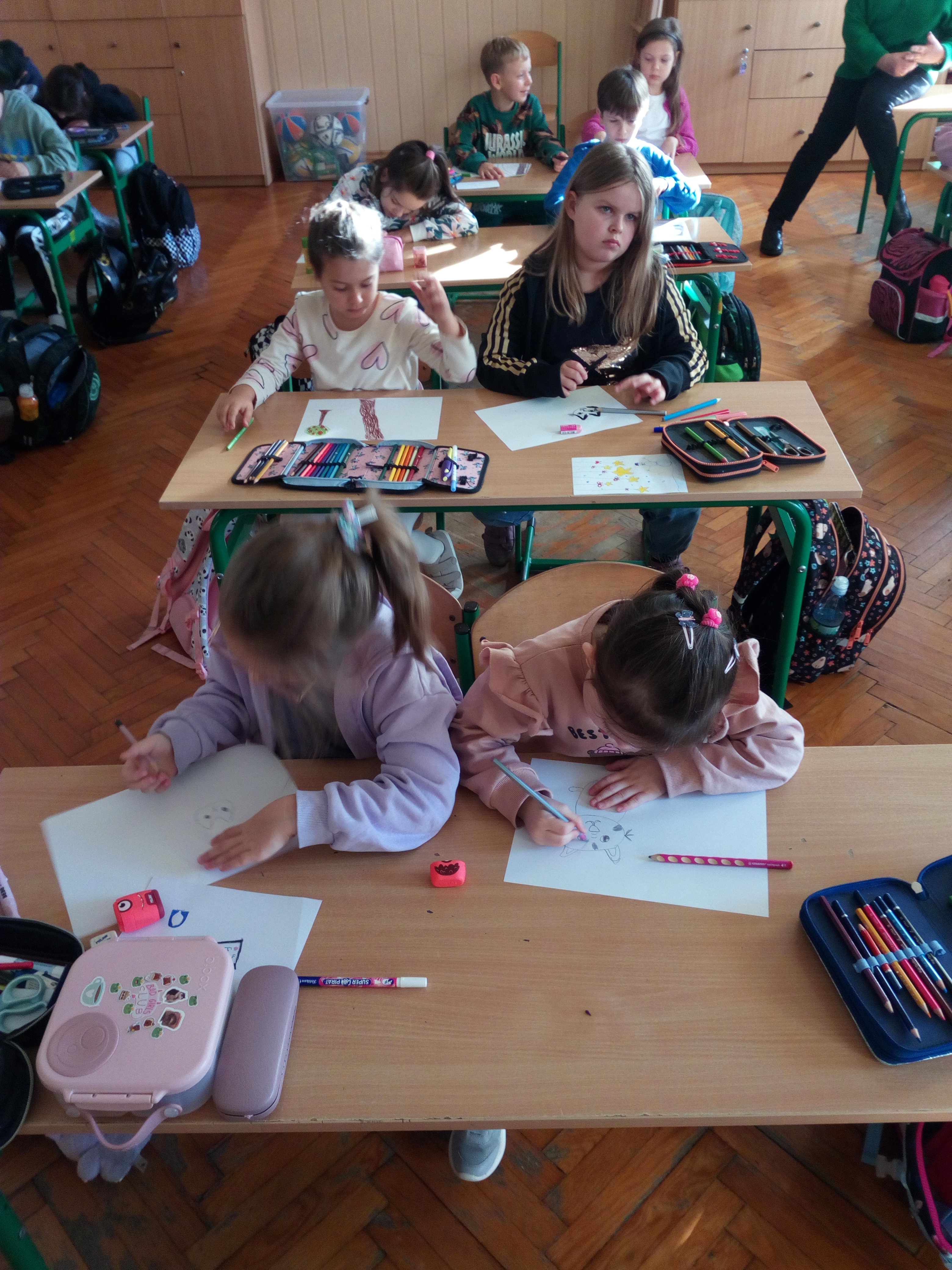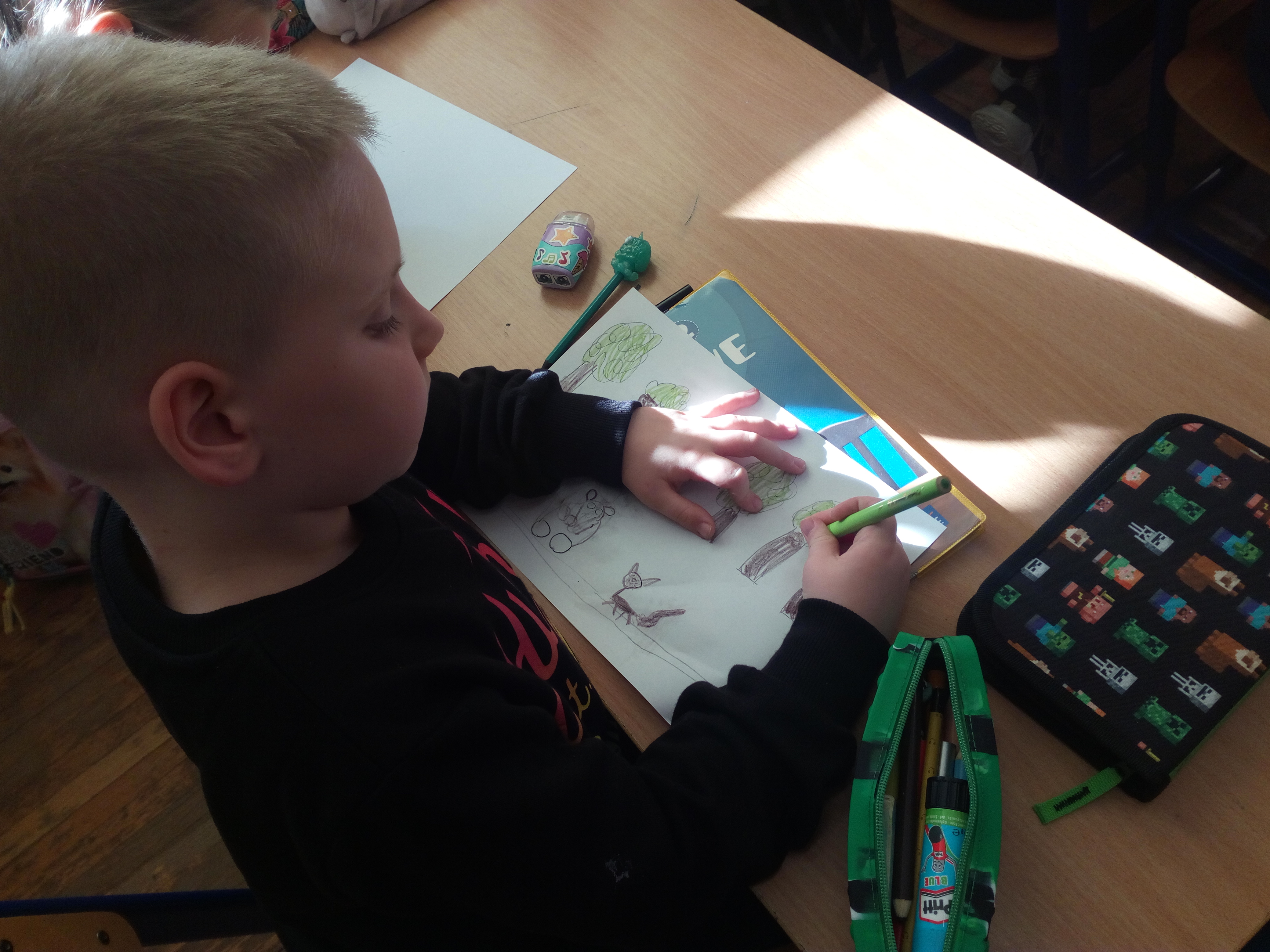 Ostatnim elementem zajęć były tworzone przez pierwszoklasistów ilustracje do wysłuchanej opowieści.