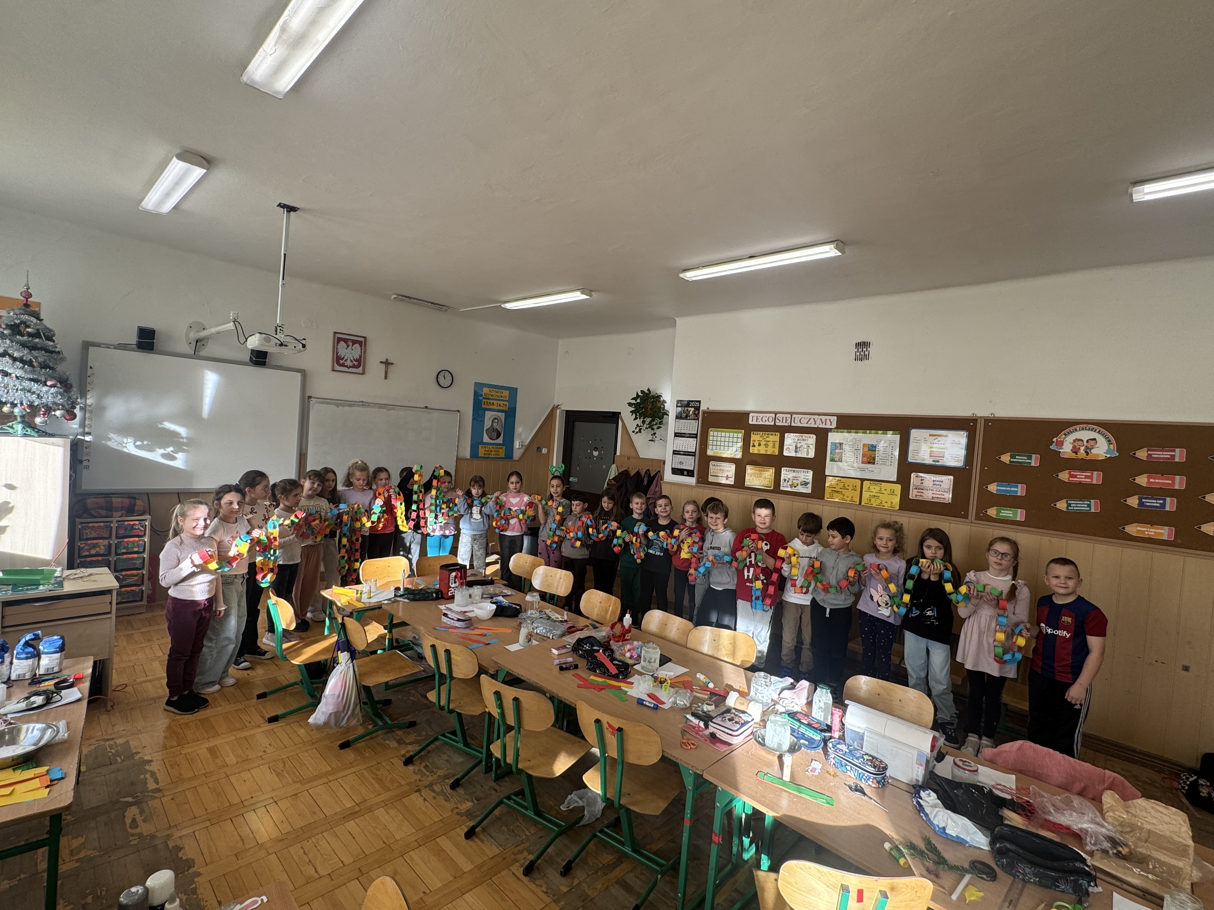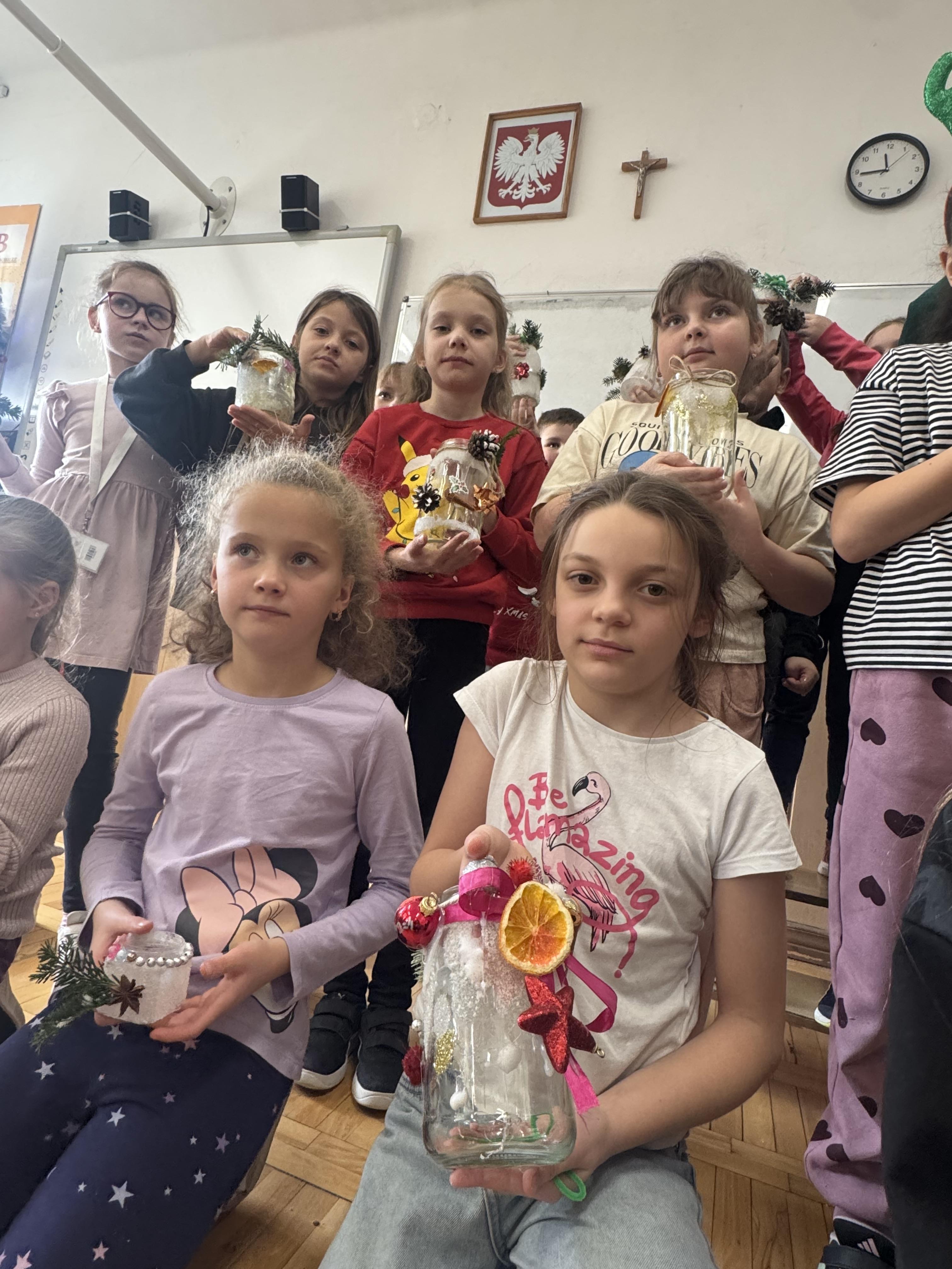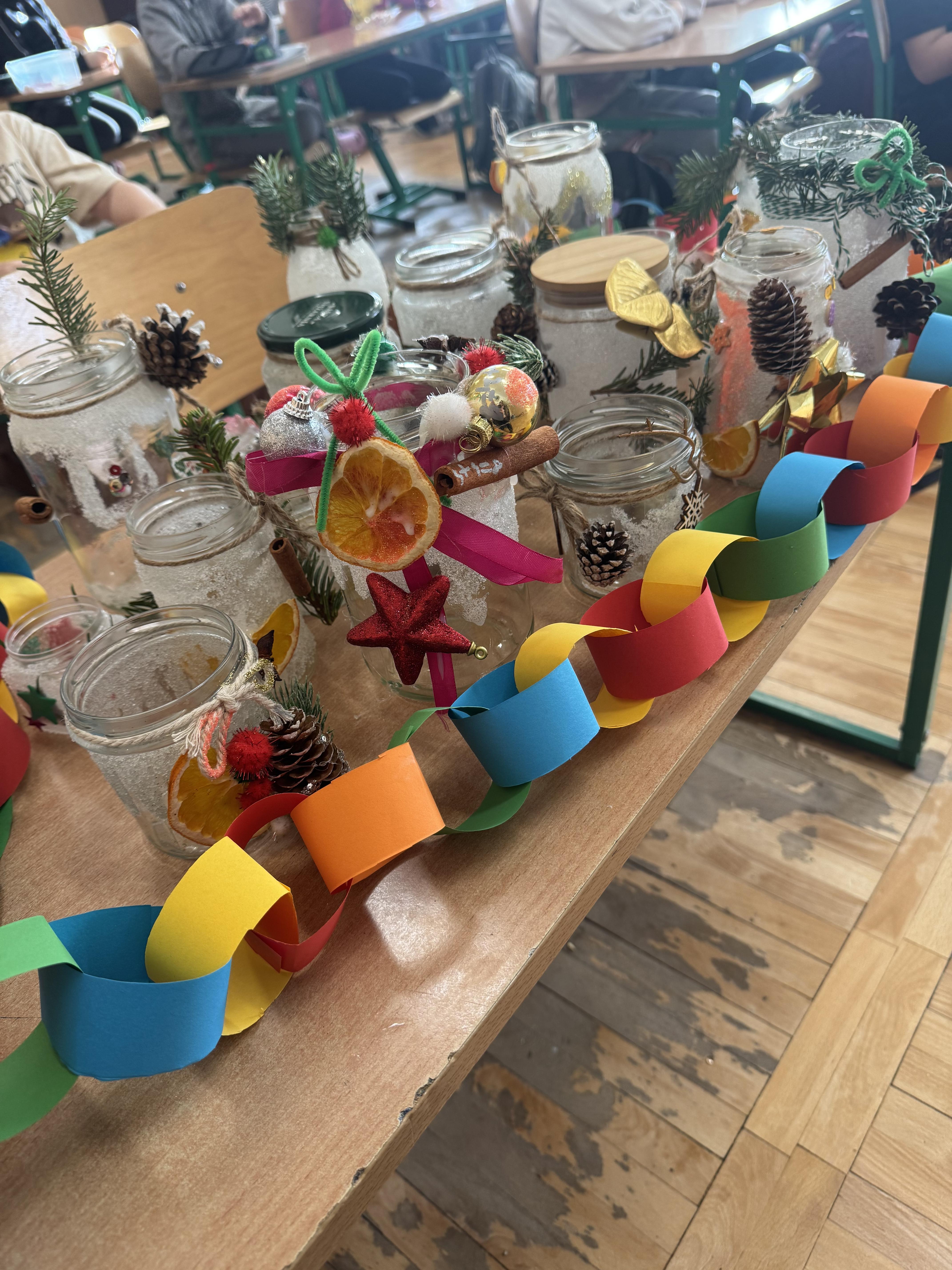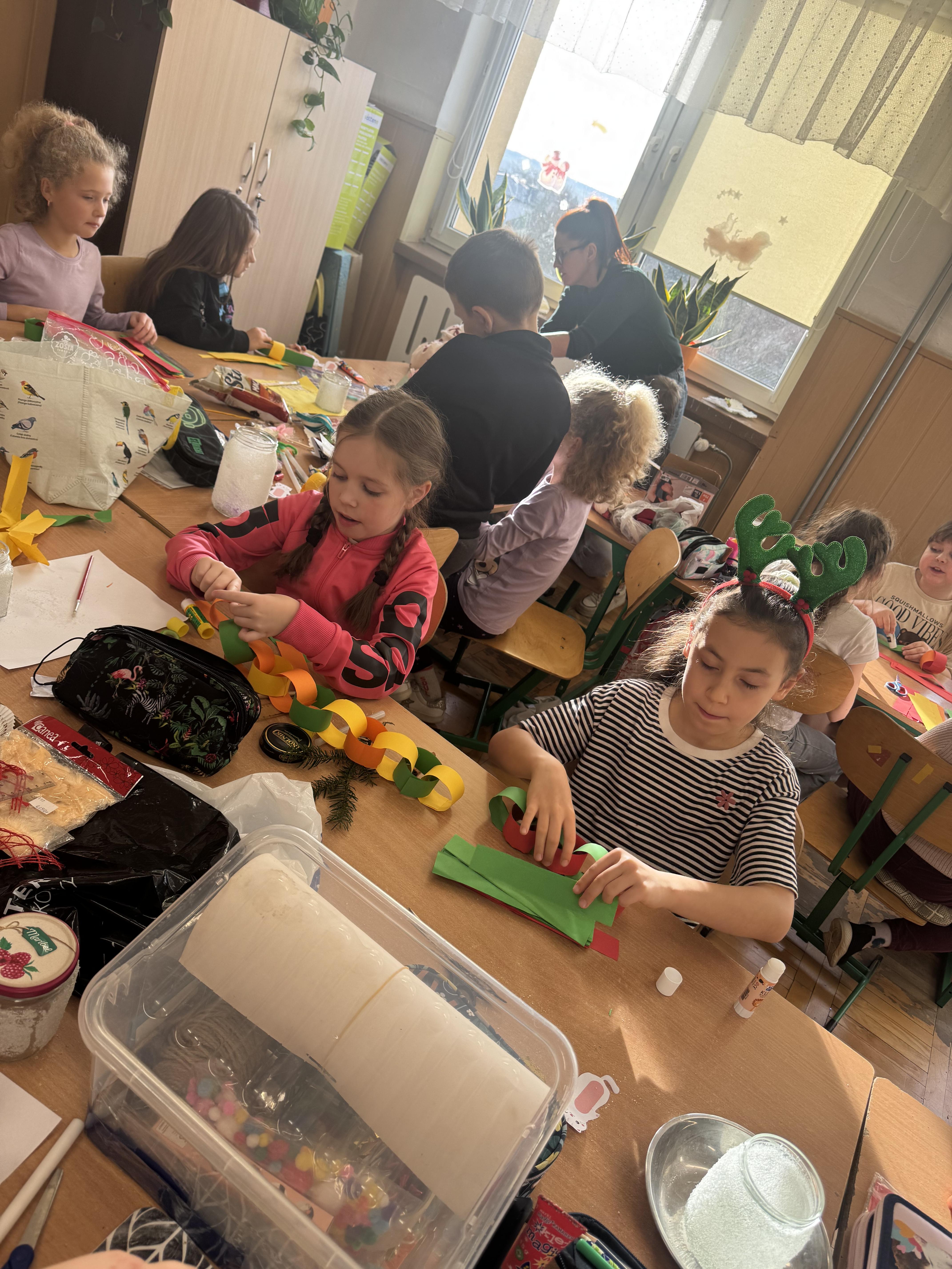Dziś w klasie II B odbyły się świąteczne warsztaty, podczas których dzieci z radością i dużym zaangażowaniem tworzyły świąteczne dekoracje. Uczniowie wykonywali kolorowe łańcuchy oraz ozdabiali słoiki, rozwijając swoją kreatywność i zdolności manualne.
