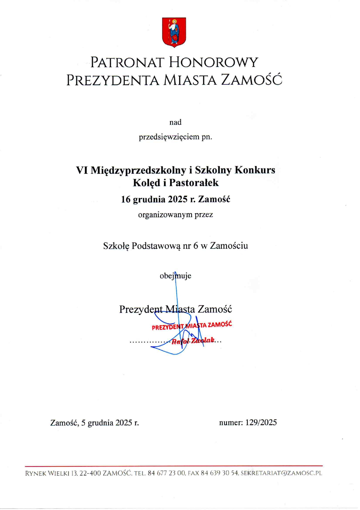 który odbędzie się 16 grudnia 2025 został obięty Honorowym Patronatem Prezydenta Miasta Zamość.