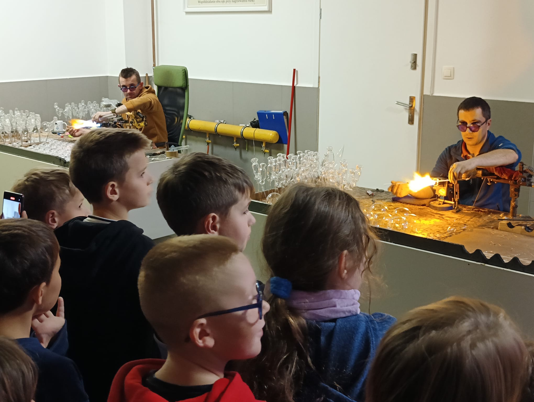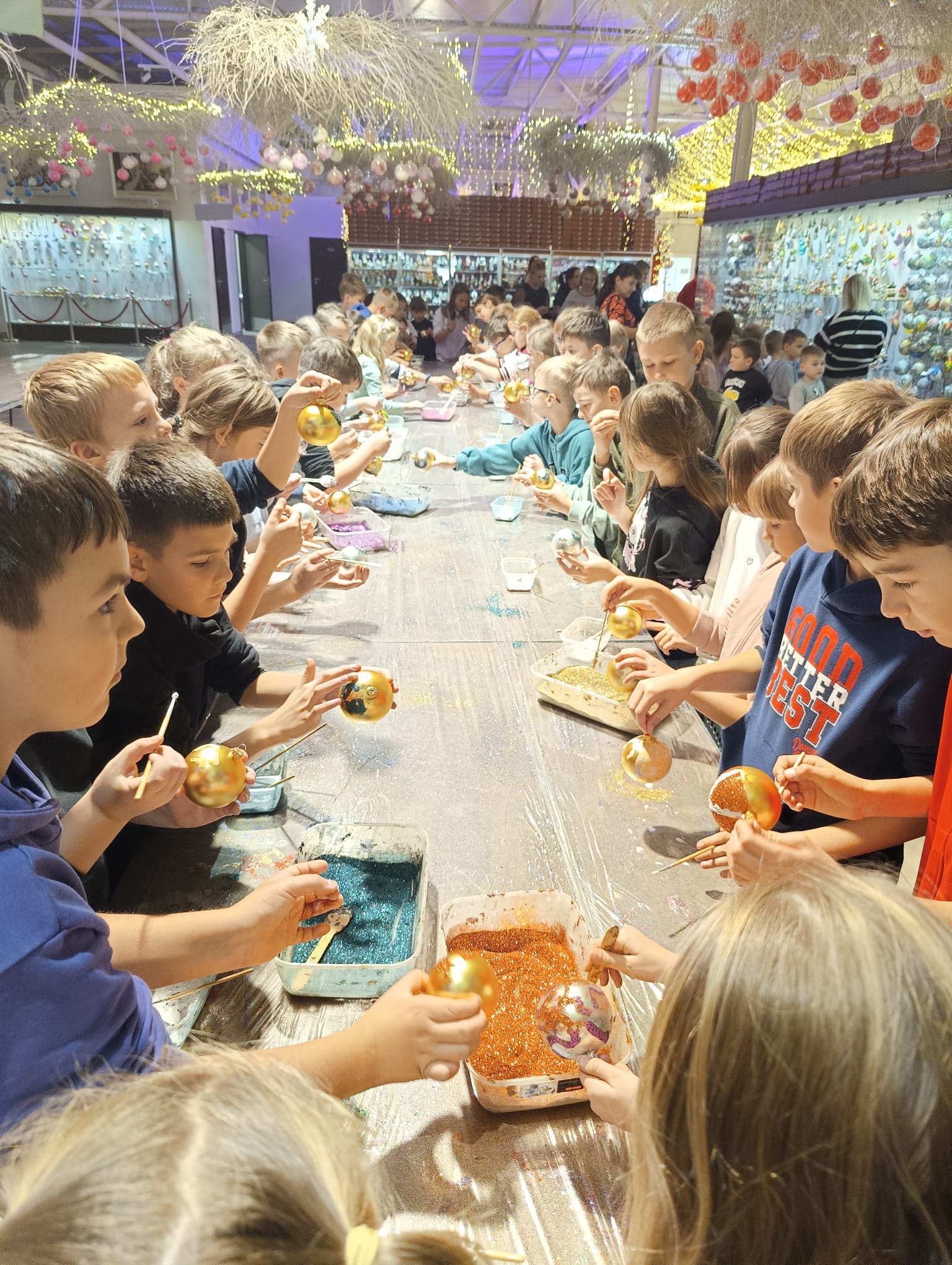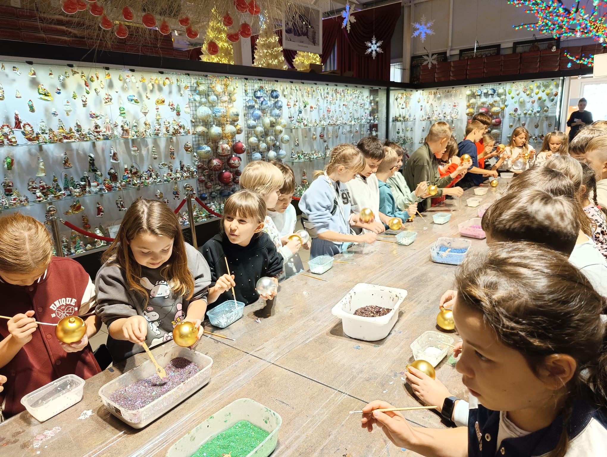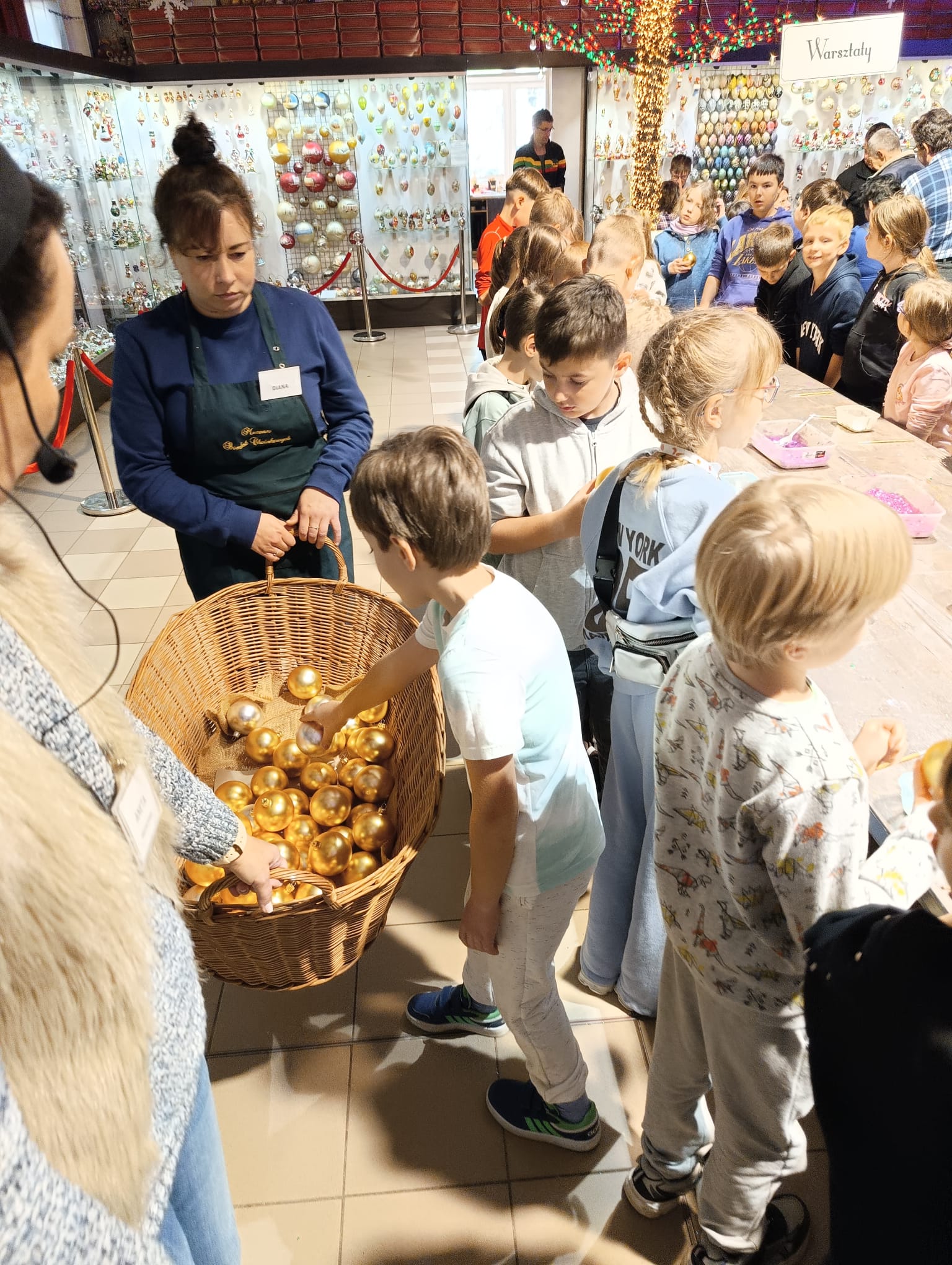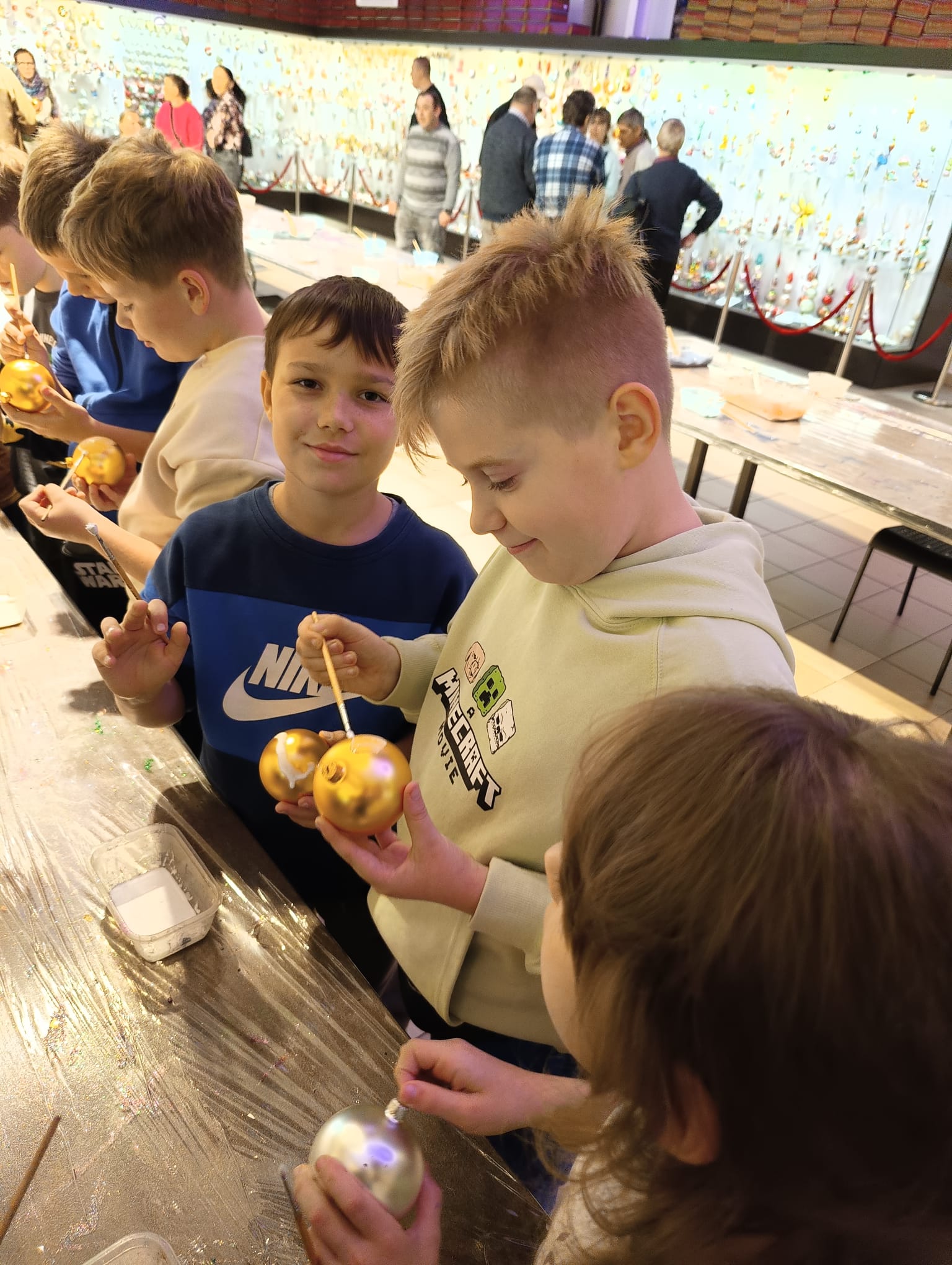 Dlatego też uczniowie klas 3a i b wraz z wychowawczyniami panią Elżbietą Ciszewską i Joanną Wcisło oraz paniami Magdą Pyrczuk i Inelią Slavińską wybrali się w bajkową podróż do Muzeum Bombki Choinkowej w Nowej Dębie. Celem tej wycieczki było zobaczenie, jak te zawieszane co roku na domowej choince szklane cudeńka powstają. Dzieci na początku pod opieka pani przewodnik zwiedziły stałą ekspozycję. Były zauroczone kolorami bombek ich ilością i rodzajami. Poznały style ubierania choinek w różnych częściach świata i epok (styl amerykański, wiktoriański, francuski, norweski, staropolski). Zobaczyły najstarsze najnowsze i najdziwniejsze bombki. Następnie zgłębiły tajemnicę procesu produkcyjnego bombek. Zobaczyły kolejne etapy powstawania bombki poznały jakie są tajniki dekorowania ozdób choinkowych, a także zobaczyły sposób formowania szkła. Dużą niespodzianką dla dzieci była możliwość zrobienia i przyozdobienia własnej, niepowtarzalnej bombki na warsztatach zorganizowanych w fabryce. Było przy tym wiele frajdy i śmiechu, każdy miał na sobie kolorowy brokat i wyglądał jak wielka mieniąca się bombka. Wracając do szkoły, śpiewając wesołe piosenki każdy myślał już o nadchodzących świętach i o choince, którą ozdobi wykonaną dzisiaj bombką.